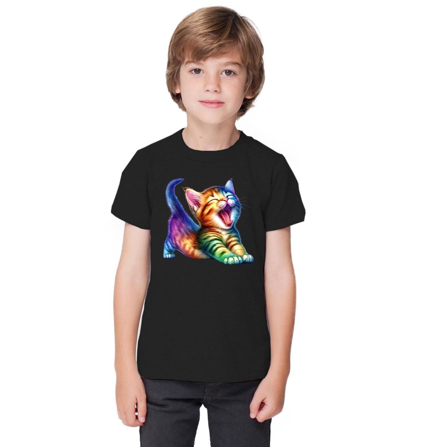 Dětské tričko Zívající Koťátko. Tento výrazný a pozitivní motiv zachycuje kotě v okamžiku čisté radosti – s otevřenou tlamou, zavřenýma očima a tělem plným energie. Duhově zbarvená srst dodává ilustraci hravost, originalitu a jedinečný umělecký nádech, který okamžitě upoutá pozornost. Každý detail podtrhuje bezstarostnost a štěstí, které dokáže vyzařovat jen kočka.