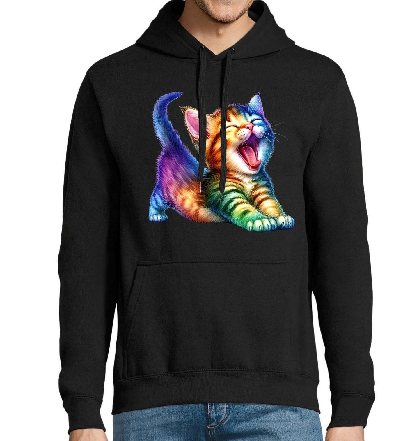 Pánská mikina Zívající Koťátko. Tento výrazný a pozitivní motiv zachycuje kotě v okamžiku čisté radosti – s otevřenou tlamou, zavřenýma očima a tělem plným energie. Duhově zbarvená srst dodává ilustraci hravost, originalitu a jedinečný umělecký nádech, který okamžitě upoutá pozornost. Každý detail podtrhuje bezstarostnost a štěstí, které dokáže vyzařovat jen kočka.