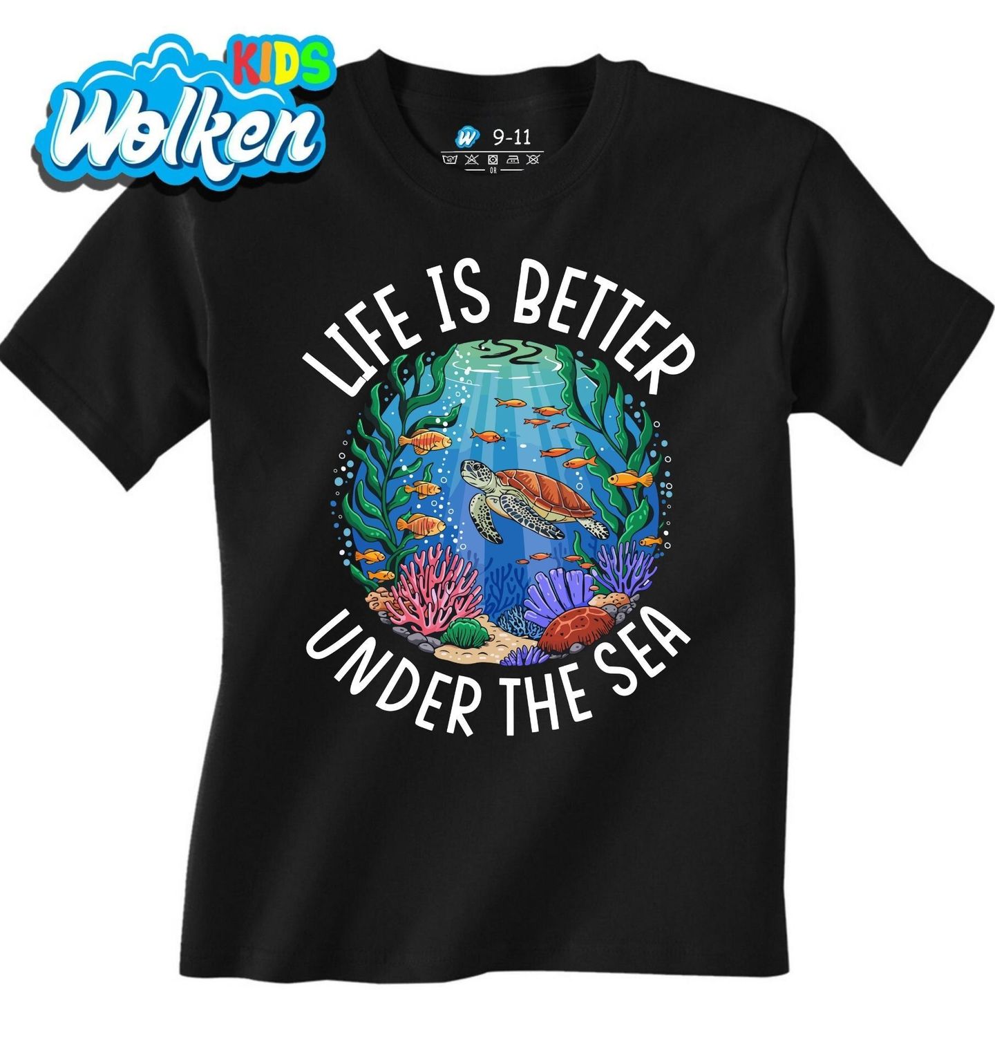 Dětské tričko Život je lepší pod mořem Life is better under the sea. Motiv zachycuje pestrý a klidný svět, který nabízí pouze moře. Barevný podmořský svět s korály, rybami a mořskou želvou vyzařuje harmonii, svobodu a krásu, kterou může nabídnout jen hloubka oceánu. Želva, jako symbol moudrosti a vyrovnanosti, doplňuje atmosféru hlubinného ticha a pohody.