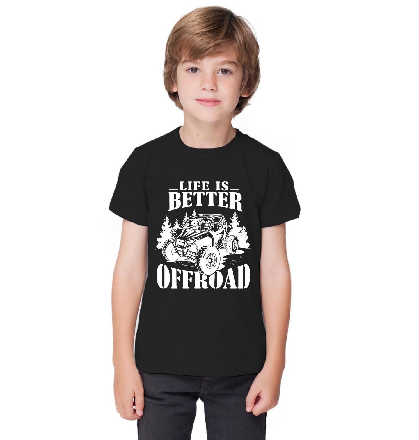 Dětské tričko Život je lepší v terénu Offroad. „Life is better offroad“. Dynamický motiv zobrazuje výkonné offroad auto připravené zdolat jakýkoliv terén. Tento design je ideální pro všechny milovníky dobrodružství, přírody a jízdy mimo silnice. Auto zde symbolizuje svobodu, adrenalin a vášeň pro objevování nových cest, kam se běžná vozidla nedostanou.