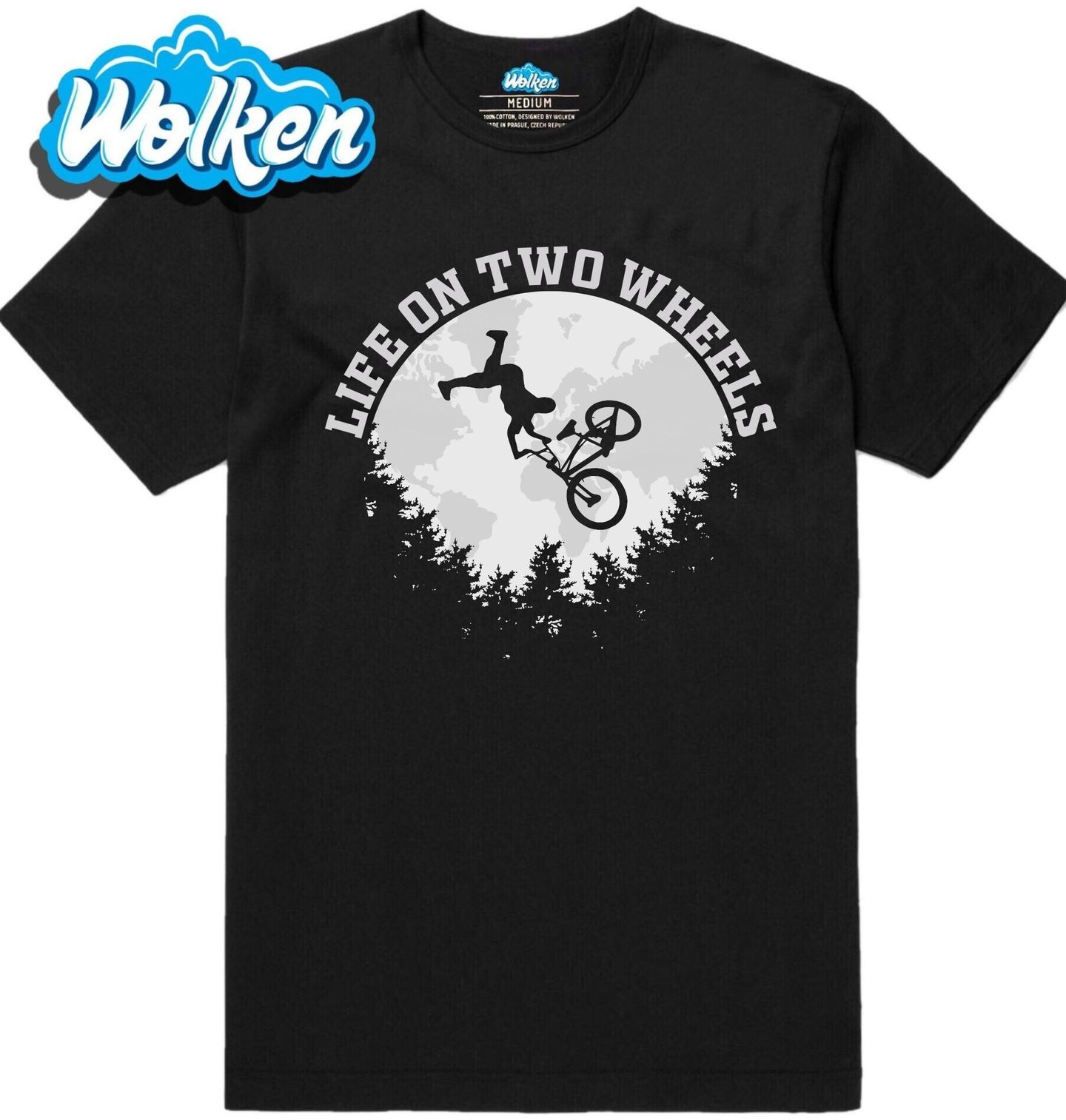Pánské tričko Život na dvou kolech. „Life on Two Wheels“ vystihuje naplno vášeň pro jízdu na kole a volnost, kterou tento sport přináší. Silueta jezdce ve vzduchu, lesní scenérie a zeměkoule v pozadí symbolizují spojení adrenalinu, přírody a svobody. Ideální pro milovníky MTB, freestyle i rekreační cyklisty, kteří žijí svůj život na dvou kolech.