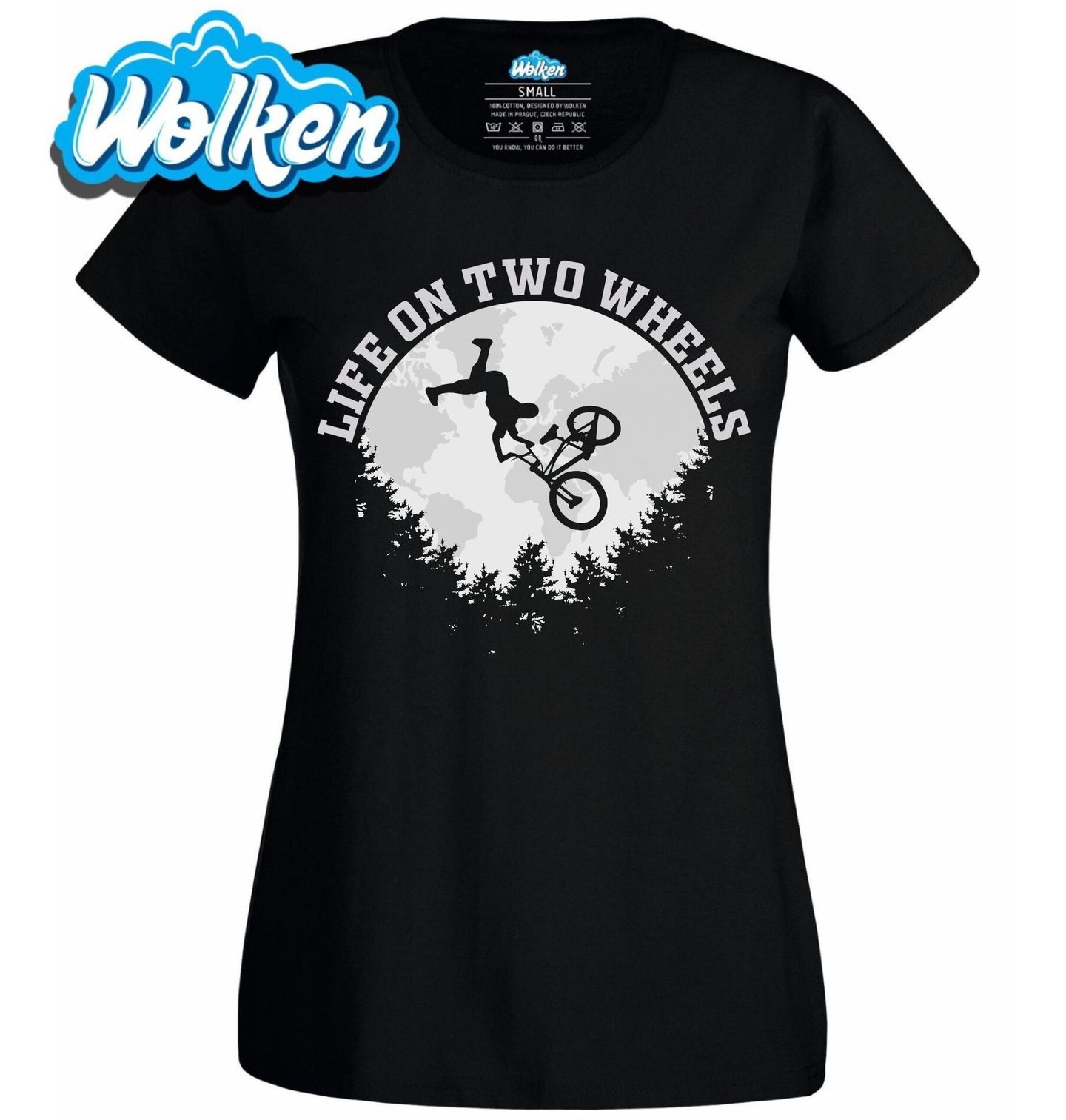 Dámské tričko Život na dvou kolech. „Life on Two Wheels“ vystihuje naplno vášeň pro jízdu na kole a volnost, kterou tento sport přináší. Silueta jezdce ve vzduchu, lesní scenérie a zeměkoule v pozadí symbolizují spojení adrenalinu, přírody a svobody. Ideální pro milovníky MTB, freestyle i rekreační cyklisty, kteří žijí svůj život na dvou kolech.