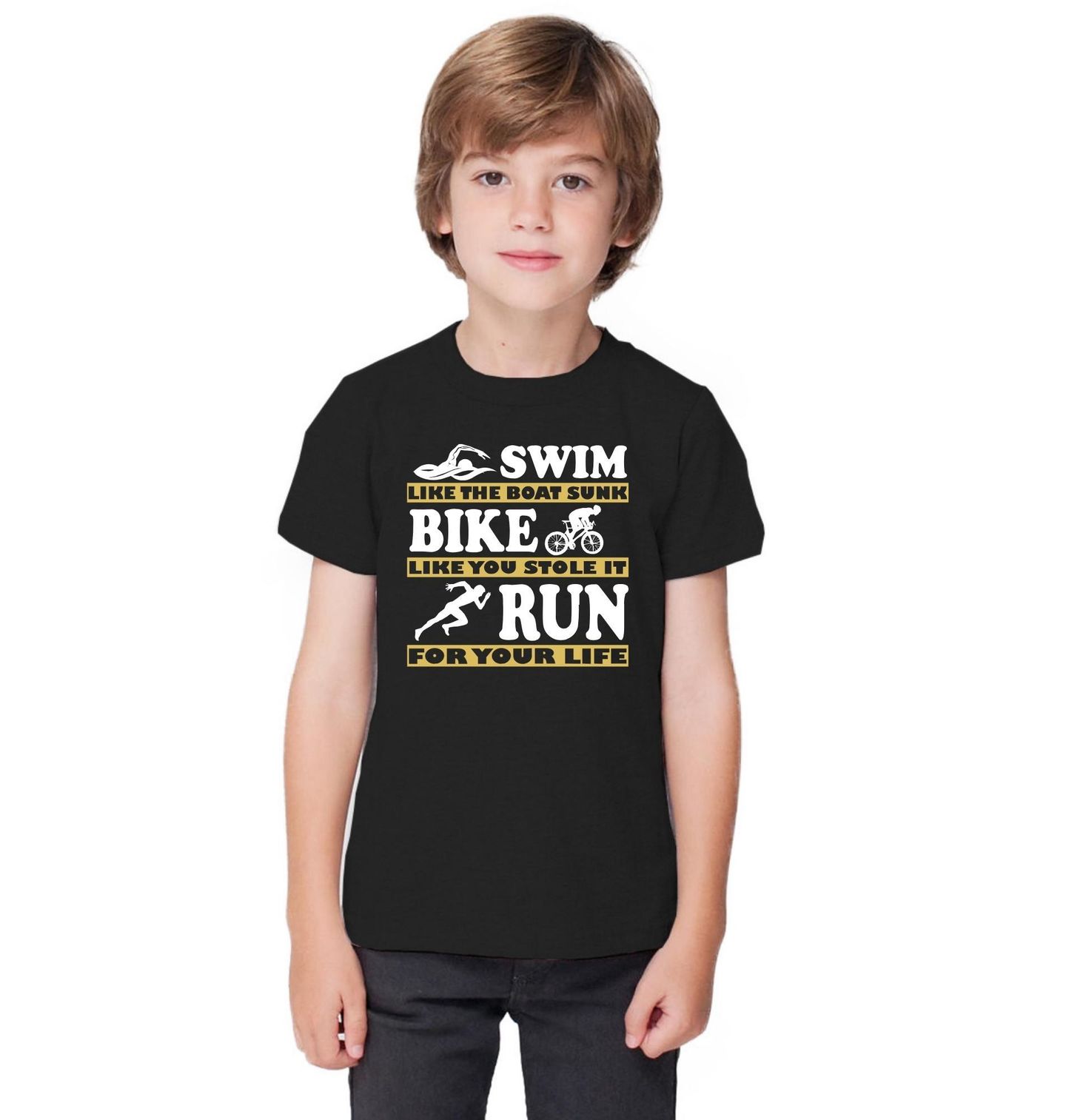 Dětské tričko Život Triatlonisty. „Swim like the boat sunk“ – plav, jako by se potopila loď. Bike like you stole it – jeď na kole, jako bys ho ukradl. Run for your life – běž, jako by ti šlo o život. Ideální volba pro sportovce, kteří berou triatlon vážně a chtějí ukázat, že plavání, kolo i běh nejsou jen trénink, ale životní styl. Výrazná grafika a silný text dělají z tohoto motivu perfektní kousek pro každého triatlonistu.