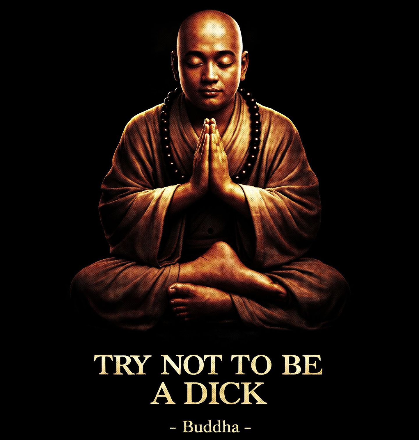 Pánská mikina Zkus nebýt debil – Buddha. “Try not to be a dick – Buddha”. Minimalistický, ale výrazný motiv zachycuje klidného budha v meditační pozici, který vyzařuje harmonii, rovnováhu a vnitřní mír. Tento design však přidává moderní twist – jednoduché, ale výstižné poselství, které připomíná, že i v dnešním světě je důležité zachovat klidnou mysl a respekt k ostatním.