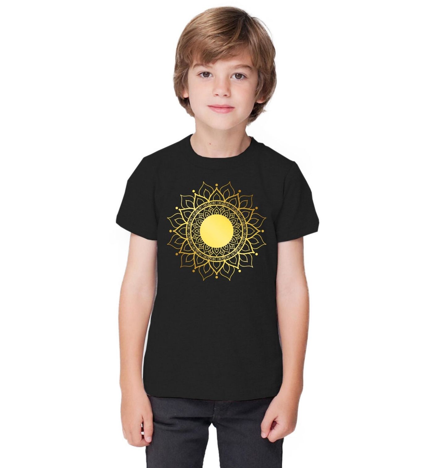 Dětské tričko Zlatá Mandala Slunce. Tento motiv působí jako vizuální meditace. Jemně propracovaná mandala v teplých zlatých tónech symbolizuje harmonii, rovnováhu a vnitřní klid. Díky symetrii a čistým liniím přirozeně přitahuje pozornost a vytváří pocit soustředění i uvolnění. Design je ideální pro každého, kdo hledá estetický motiv s hlubším významem.