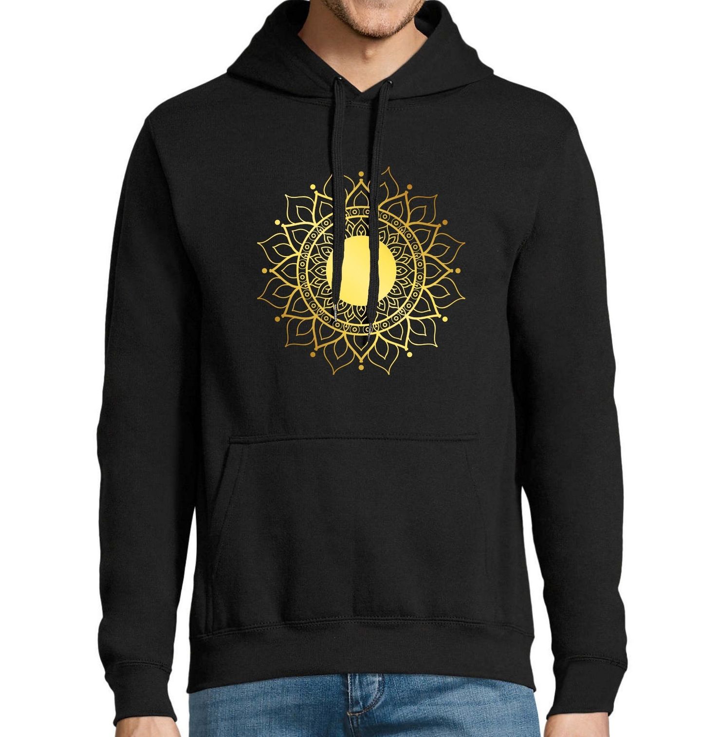Pánská mikina Zlatá Mandala Slunce. Tento motiv působí jako vizuální meditace. Jemně propracovaná mandala v teplých zlatých tónech symbolizuje harmonii, rovnováhu a vnitřní klid. Díky symetrii a čistým liniím přirozeně přitahuje pozornost a vytváří pocit soustředění i uvolnění. Design je ideální pro každého, kdo hledá estetický motiv s hlubším významem.