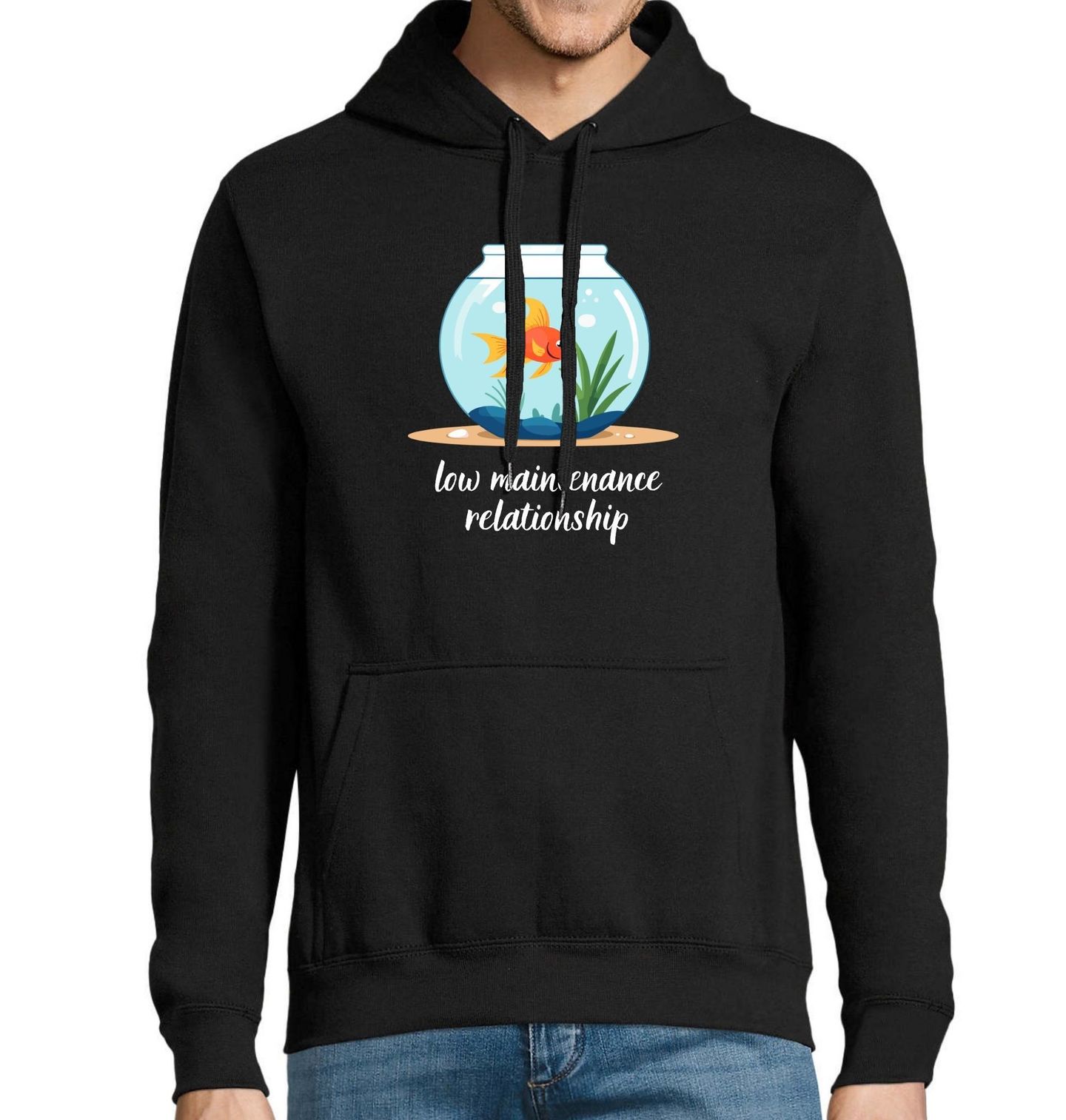 Pánská mikina Zlatá Ryba v Akvárku Low Maintenance Relationship. Zlatá ryba v akvárku představuje ideální "low maintenance" vztah s nízkými nároky na údržbu“ – žádné hádky, žádné drama, jen ticho a bublinky. Ideální dárek pro ty, kteří mají smysl pro humor a slabost pro akvárka i minimalistické soužití.