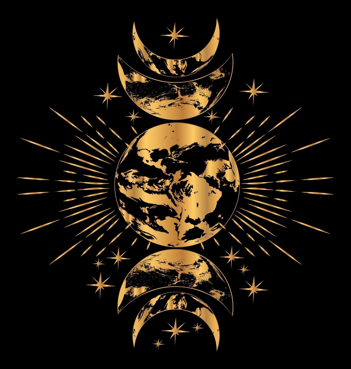 Dámské tričko Zlaté Fáze Měsíce. Elegantní a mystický motiv zachycuje propojení vesmíru, kde měsíc a jeho fáze obklopují zářící Zemi v harmonickém uspořádání. Zlaté prvky na tmavém pozadí vytváří luxusní a zároveň duchovní atmosféru, která symbolizuje cyklus života, energii vesmíru a neustálou proměnu. Tento design osloví všechny, kdo cítí spojení s přírodou, vesmírem a jeho rytmy.