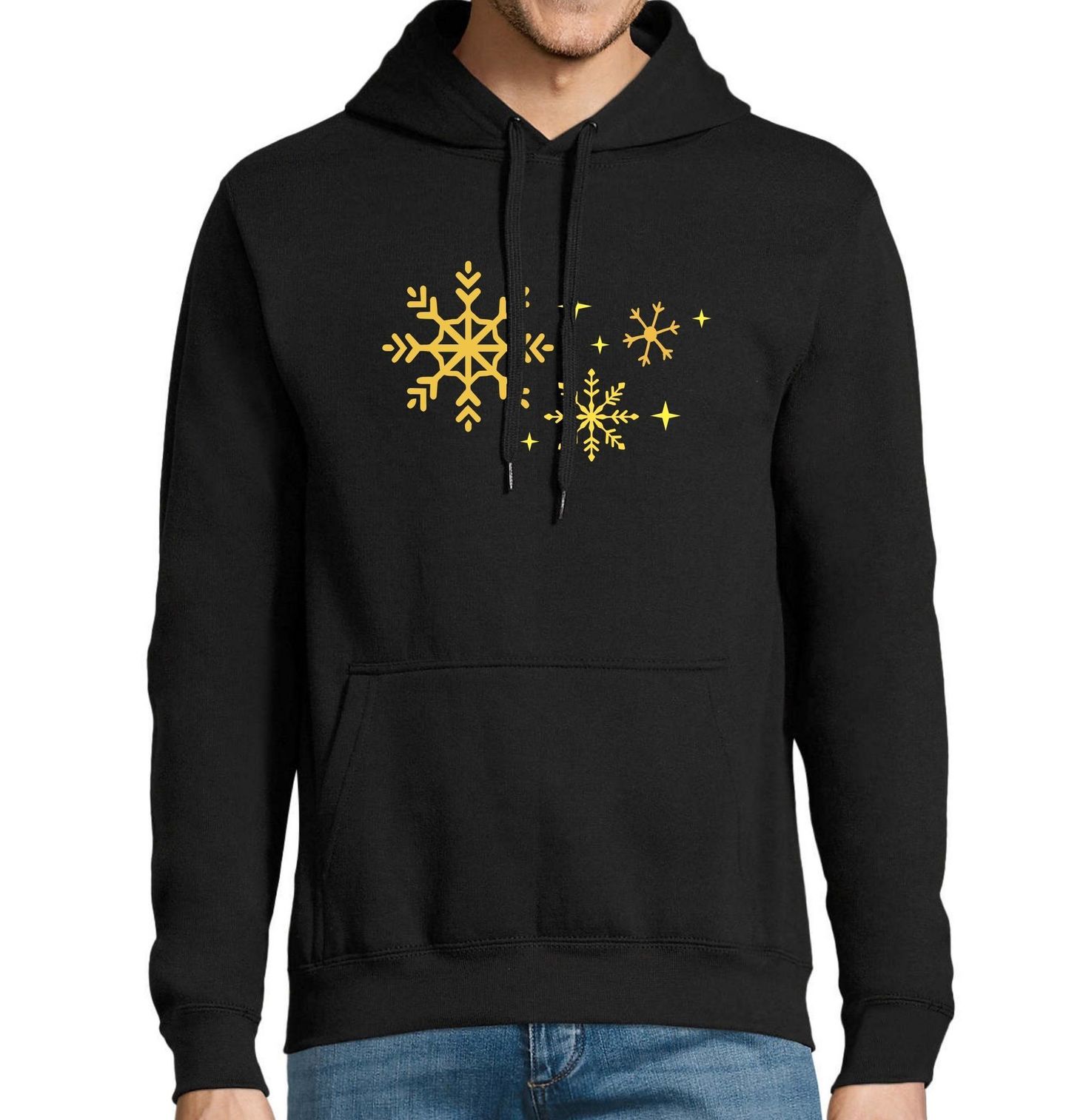 Pánská mikina Zlaté Sněhové Hvězdy. Elegantní zimní motiv plný třpytu – vločky a hvězdy ve zlatém designu rozzáří každý produkt a přenesou vás rovnou do pohádkové atmosféry Vánoc. Perfektní volba pro ty, kteří chtějí nosit nebo darovat trochu sváteční radosti s decentním a přitom výjimečným vzhledem na Vánoce.