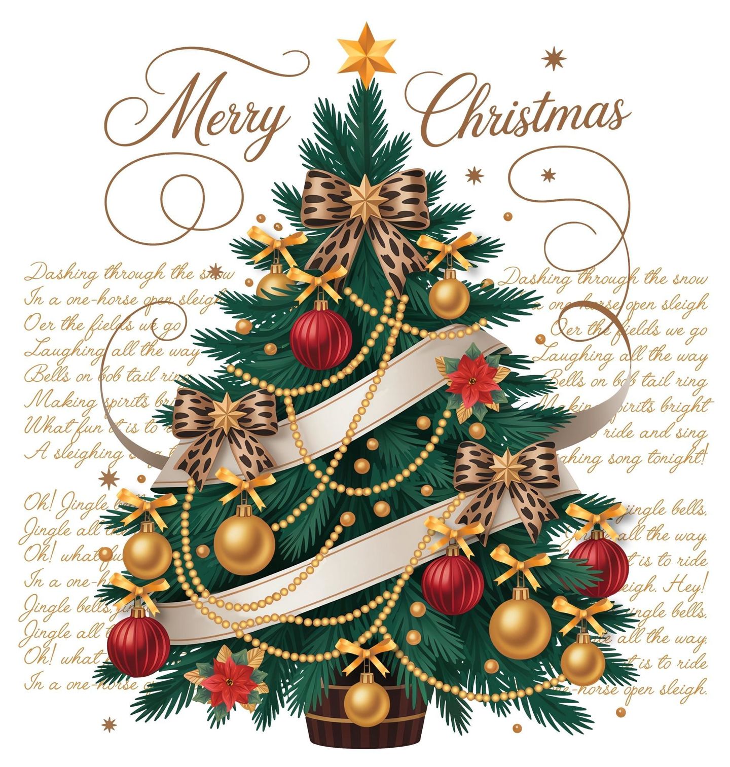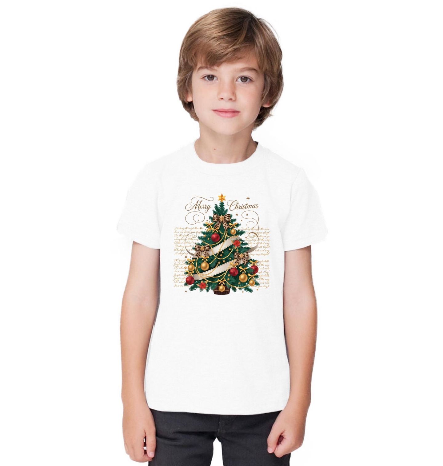 Dětské tričko Zlaté Vánoce Merry Christmas. Přeneste se do světa elegance a třpytu s tímto stylovým motivem — Vánoce s nádechem luxusu! Bohatě zdobený vánoční stromeček s červenými a zlatými koulemi, perlovými řetězy a mašlemi s leopardím vzorem je ideální volbou pro ty, kdo chtějí slavit ve velkém stylu.