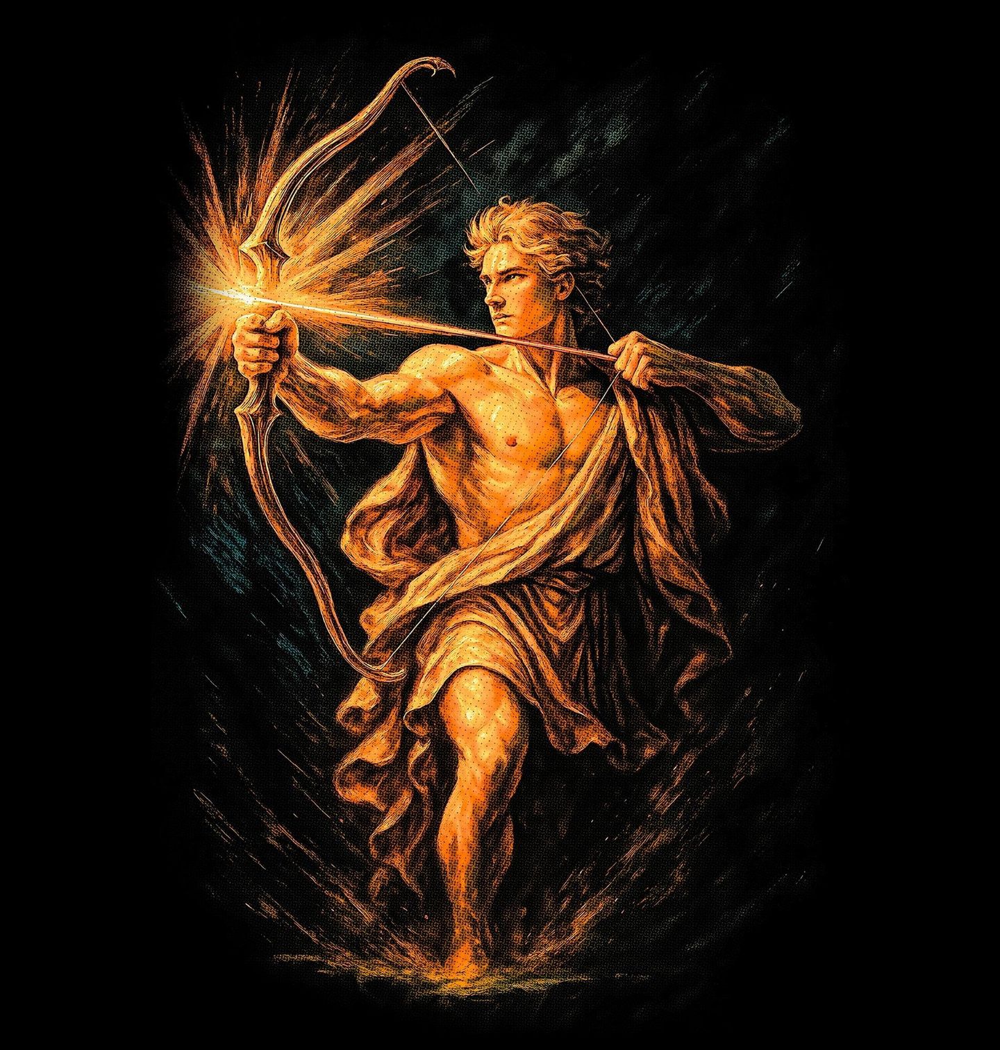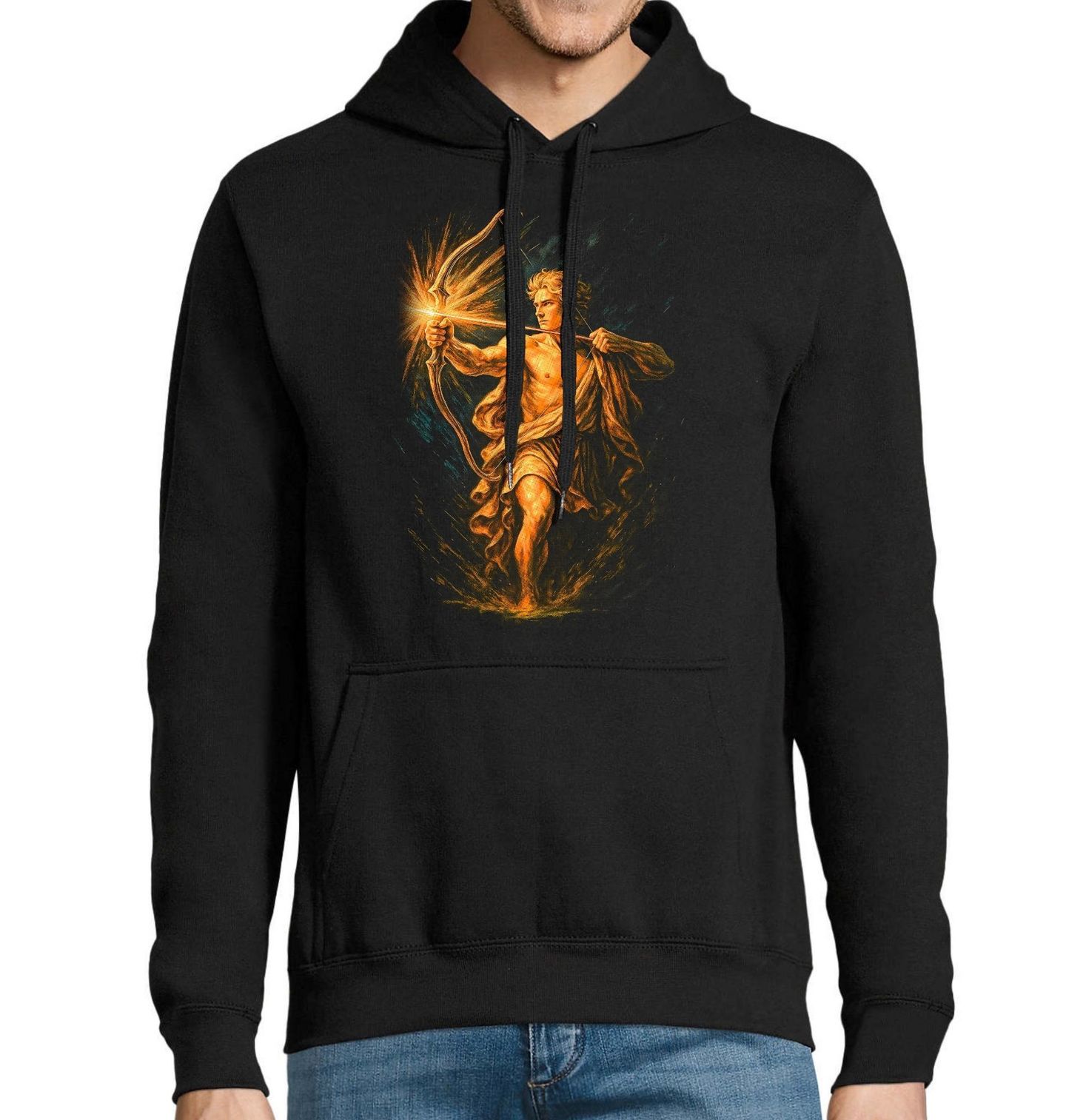 Pánská mikina Zlatý Apollón. Tento dynamický motiv zobrazuje Apollóna, jednoho z nejvýznamnějších bohů, které zná řecká mytologie. Bůh světla, slunce, hudby, věštby a přesné mušky je zde zachycen v okamžiku napětí – s nataženým lukem a zářícím šípem, který symbolizuje sílu pravdy a neomylnost božského zásahu. Jeho zlatý luk nebyl jen zbraní, ale také symbolem spravedlnosti, ochrany a trestu.