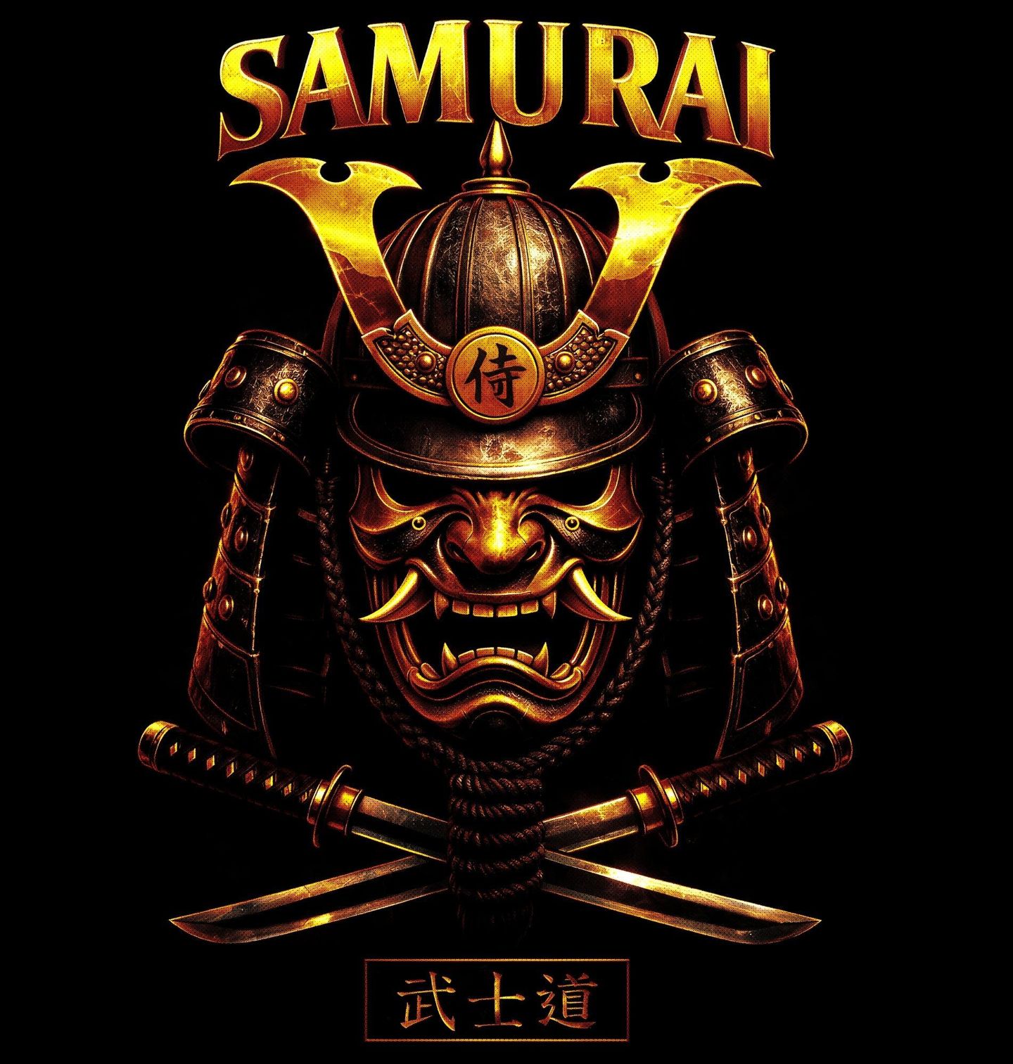 Pánská mikina Zlatý Démon Oni Samurai. Nápis „SAMURAI“ znamená „samuraj“, tedy japonský válečník, a znak dole „武士道“ (bušidó) znamená „cesta bojovníka“ – kodex cti, kterým se samuraj řídil. Dominantním prvkem je detailně zpracovaná maska Oni, která představuje démonickou energii, ochranu a respekt. V kombinaci s prvky zbroje a zkříženými meči vytváří motiv silnou atmosféru, kterou zosobňuje každý pravý samuraj.