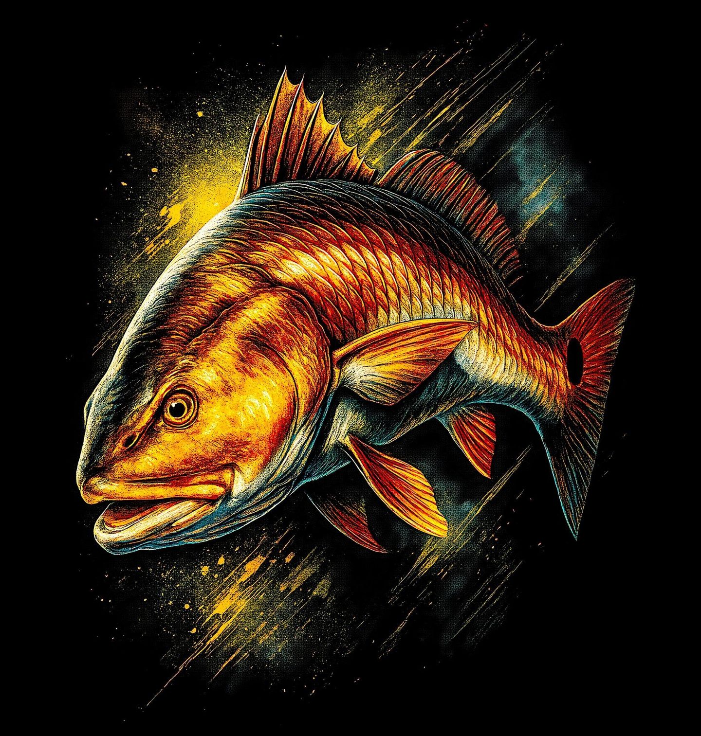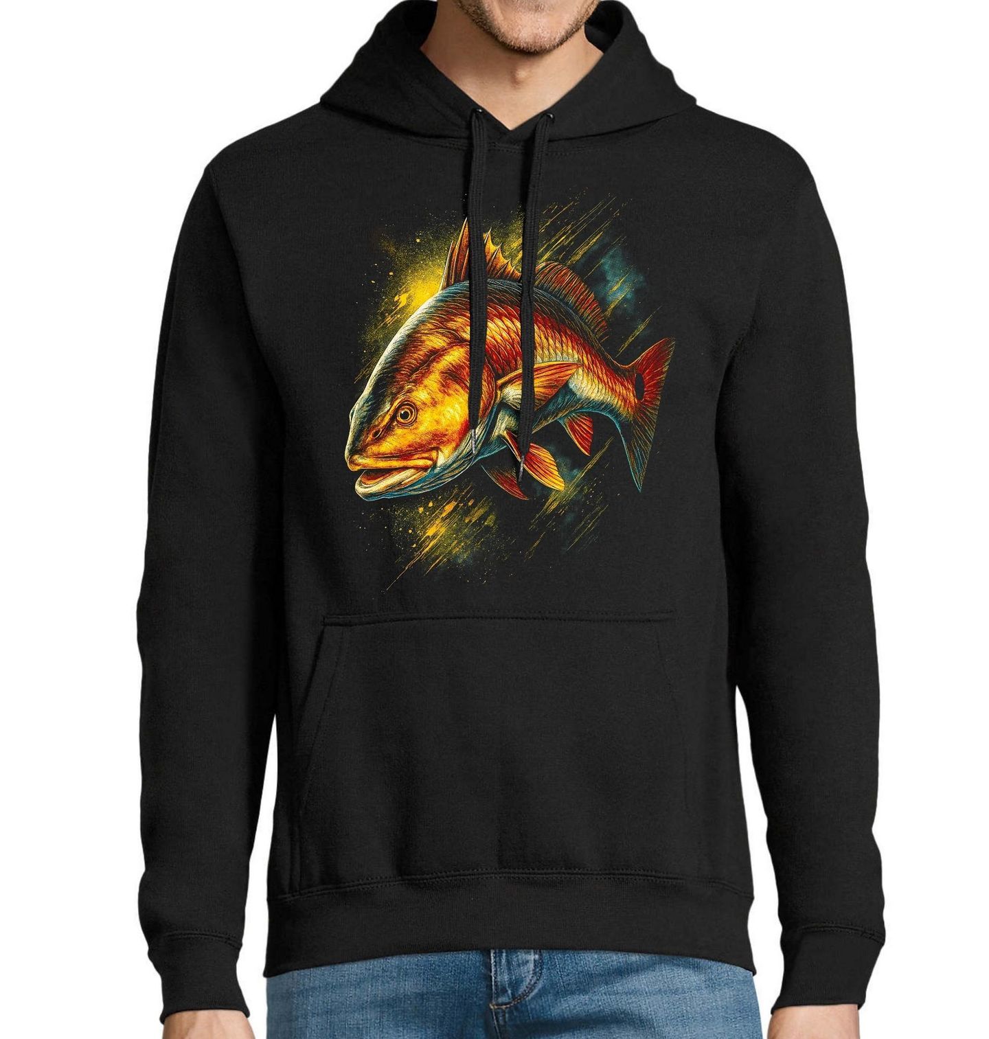 Pánská mikina Zlatý dravec Okoun říční. Výrazný motiv zobrazuje okouna říčního (Perca fluviatilis) v plné síle – dravou rybu s typickou trnitou hřbetní ploutví, silným tělem a soustředěným pohledem. Design je vytvořen pro každého, komu je rybaření blízké nejen jako koníček, ale jako životní styl. Rybář v tomto motivu pozná dobře známý pocit napětí, souboj s rybou a radost z úspěšného záběru.