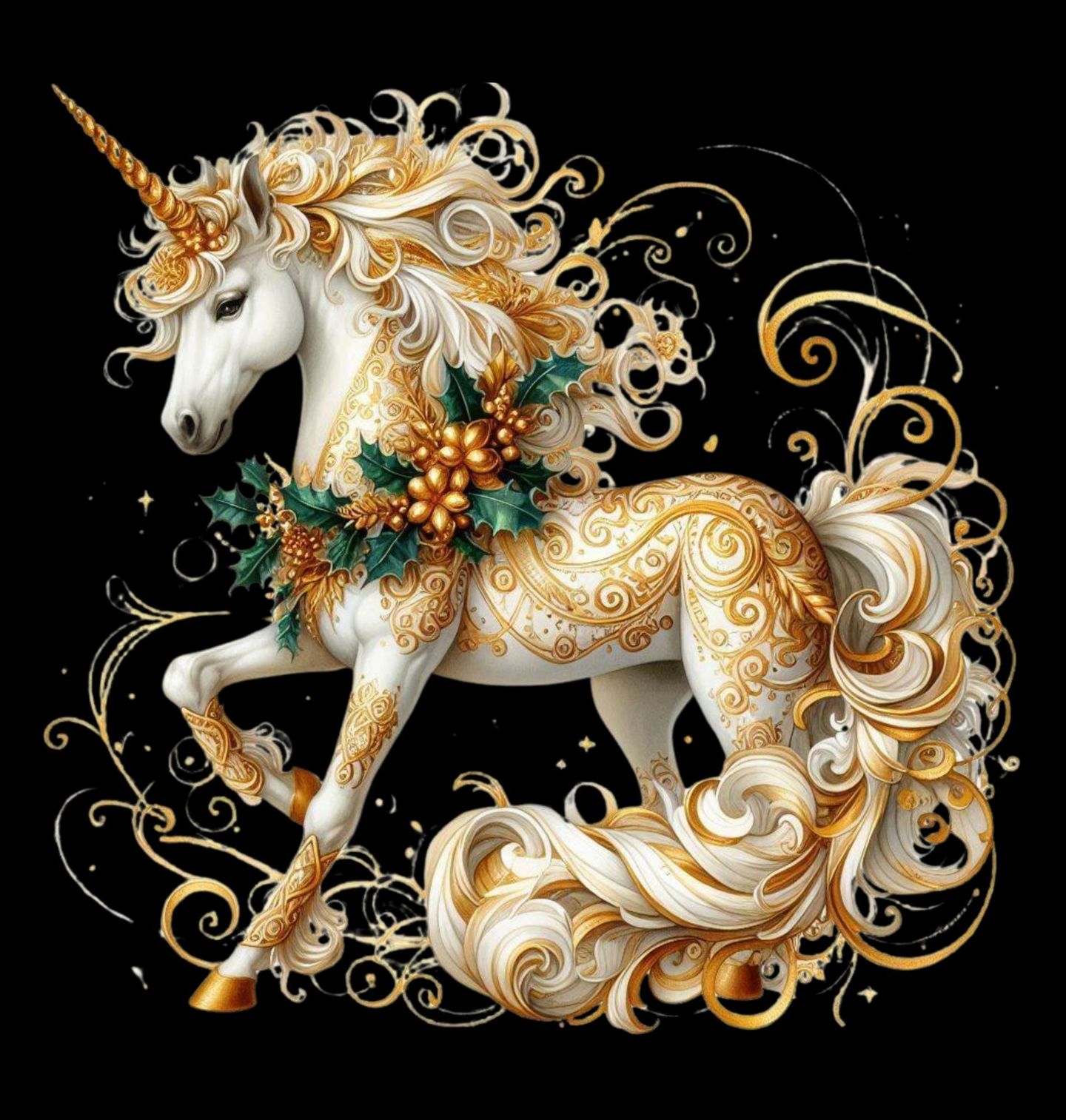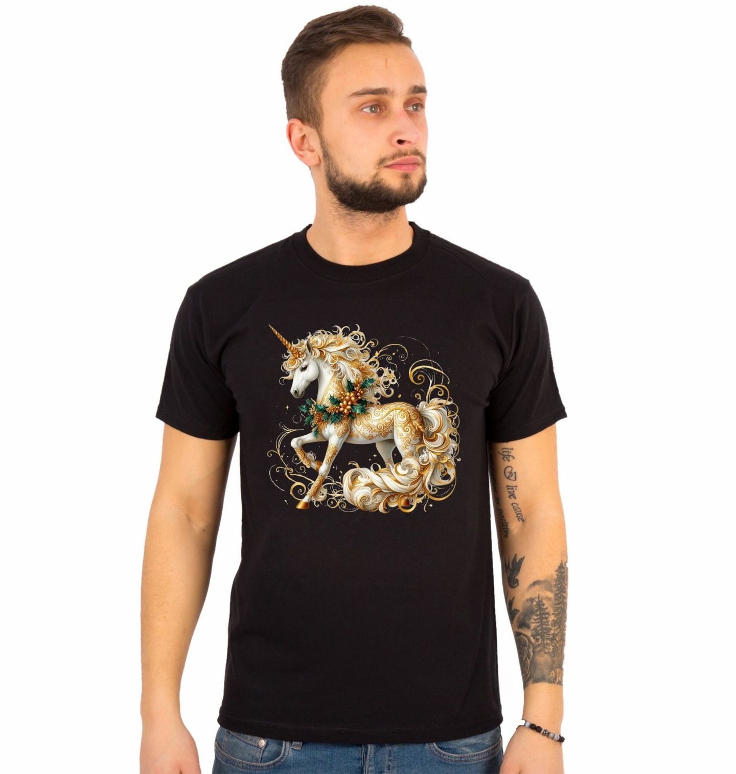 Pánské tričko Zlatý Jednorožec. Tento kouzelný jednorožec zdobený zlatými ornamenty, sváteční cesmínou a elegantní hřívou přináší dětem tu pravou vánoční atmosféru. Stylový a slavnostní potisk zaujme na první pohled – ideální volba pro každé dítě, které miluje Vánoce, pohádky a magická stvoření.