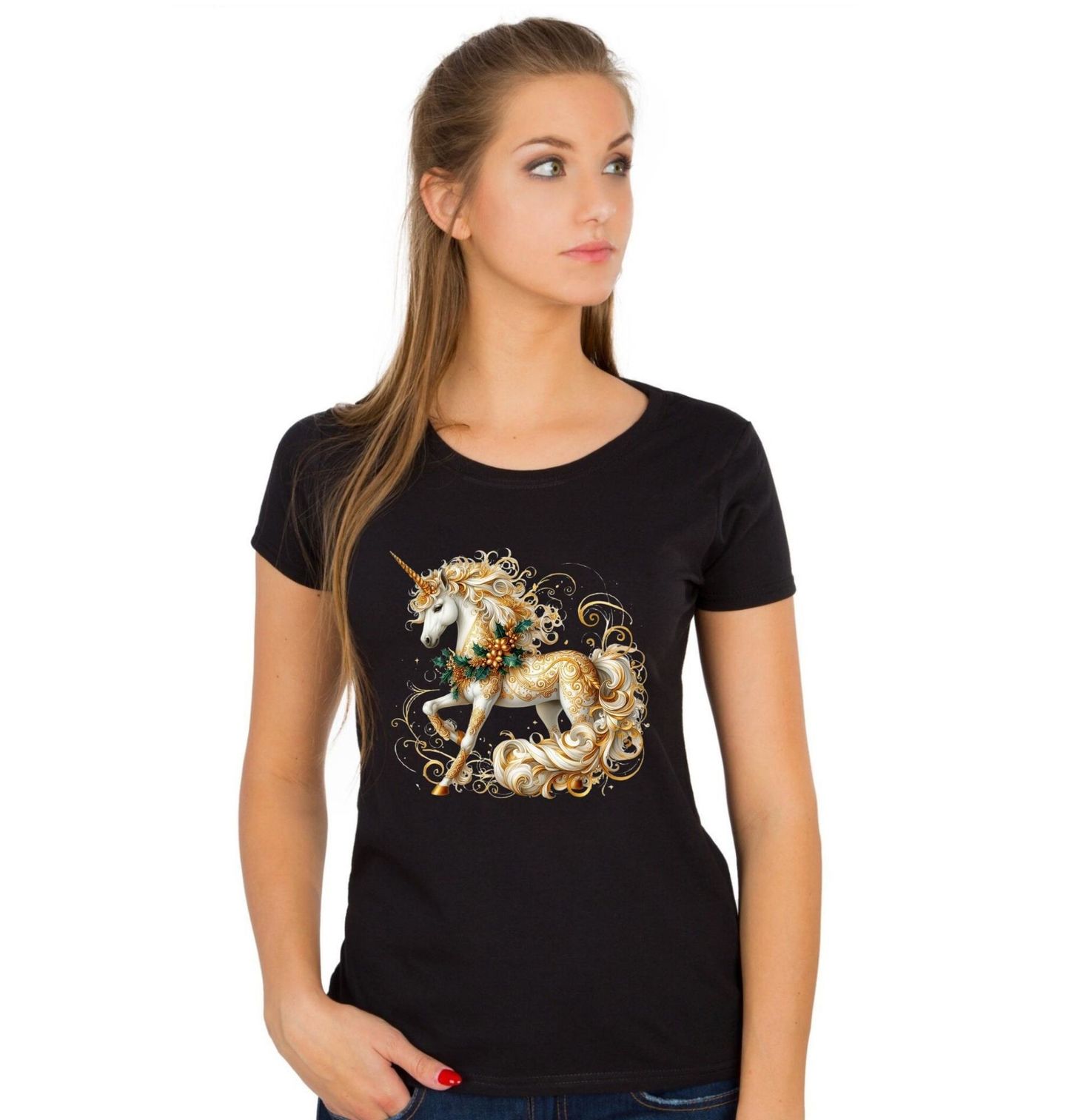 Dámské tričko Zlatý Jednorožec. Tento kouzelný jednorožec zdobený zlatými ornamenty, sváteční cesmínou a elegantní hřívou přináší dětem tu pravou vánoční atmosféru. Stylový a slavnostní potisk zaujme na první pohled – ideální volba pro každé dítě, které miluje Vánoce, pohádky a magická stvoření.