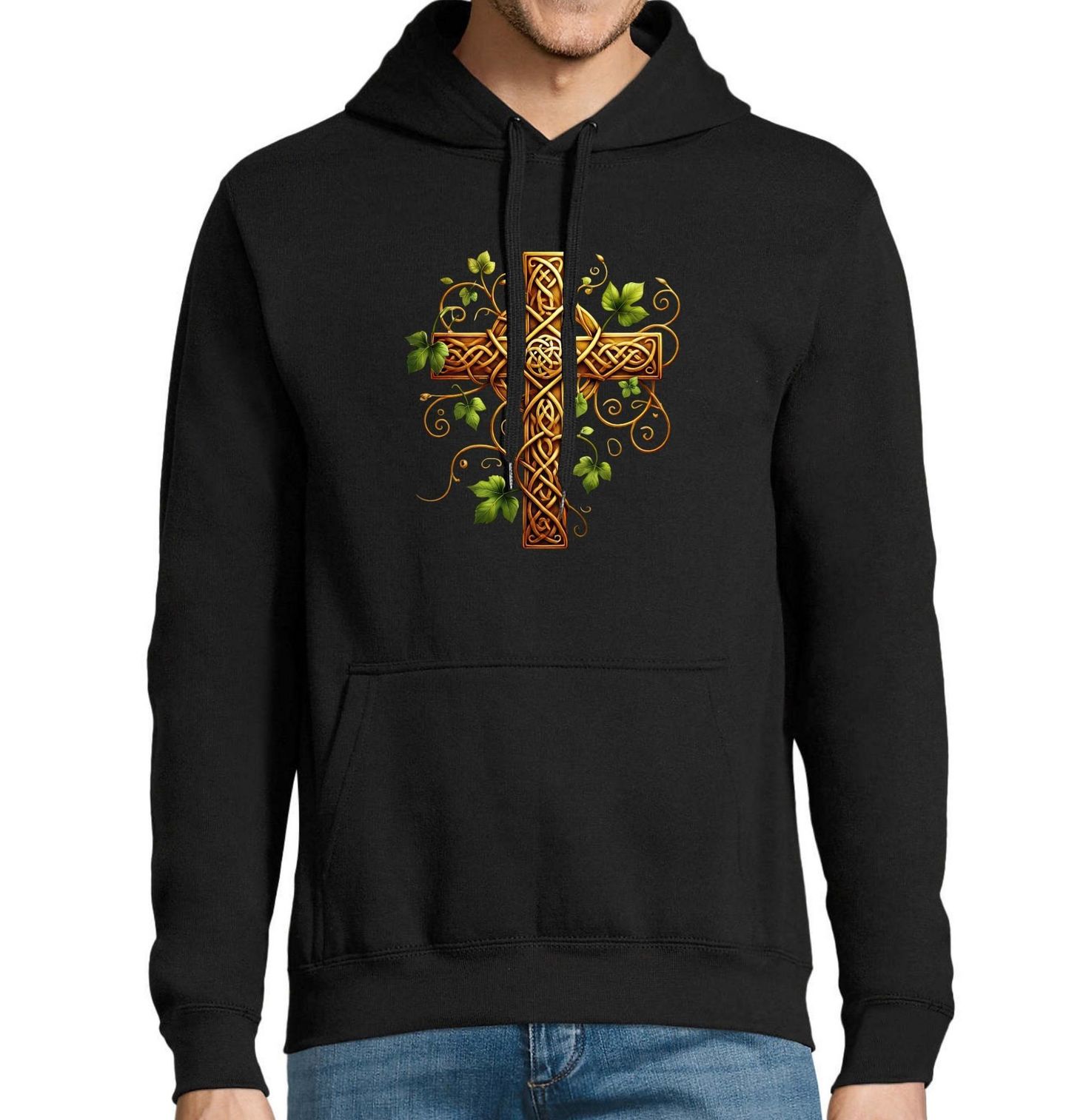 Pánská mikina Zlatý Keltský Kříž. Elegantní tričko s motivem zlatého keltského kříže ovitého břečťanem je dokonalým spojením starověké symboliky a přírodní síly. Keltové vnímali kříž jako znak rovnováhy, spojení duchovna a světa, zatímco břečťan symbolizuje věčnost, životní sílu a věrnost.