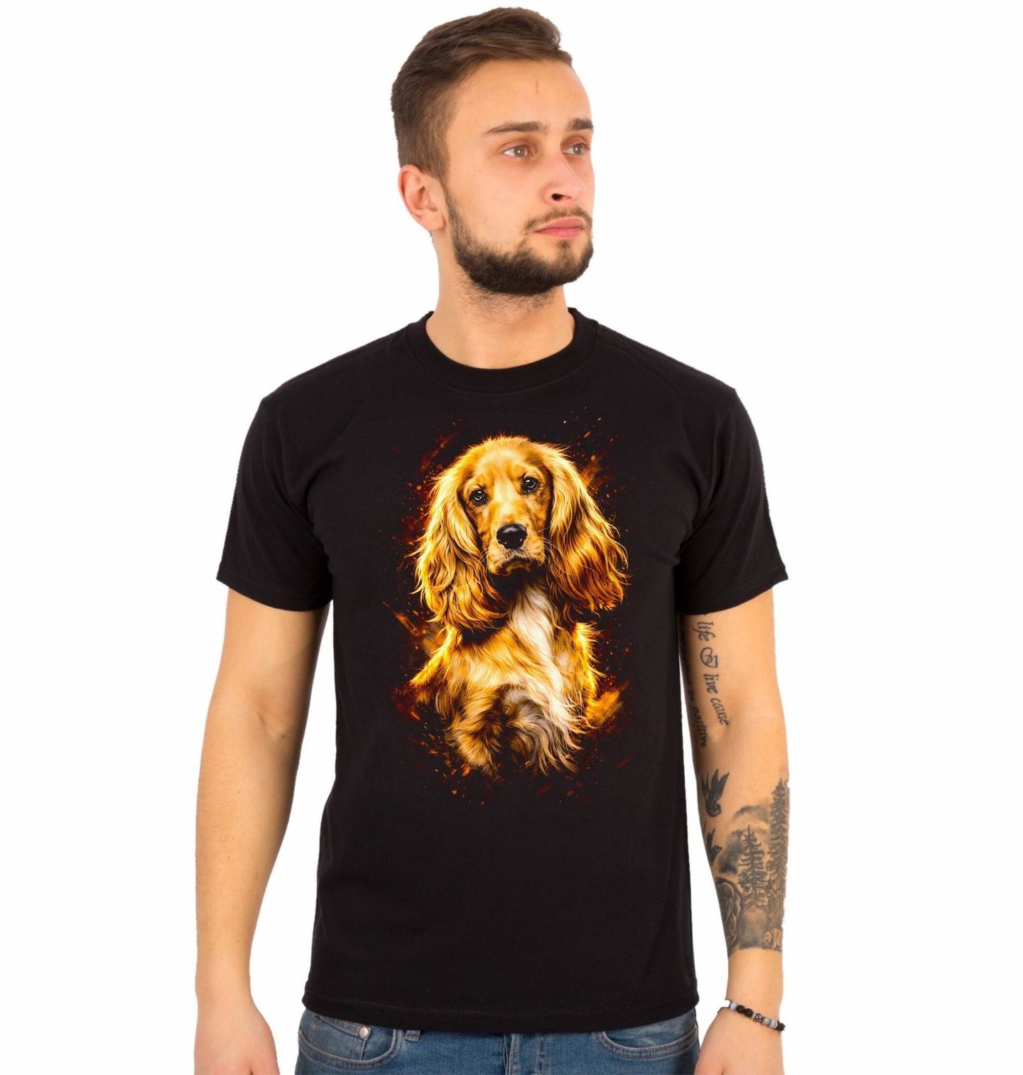 Pánské tričko Zlatý Kokršpaněl. Tento působivý motiv zachycuje krásného psa s dlouhýma ušima a jemnou, lesklou srstí. Jedná se o plemeno anglický kokršpaněl, které je známé svou přátelskou povahou, inteligencí a elegancí. Umělecké zpracování se zlatavými efekty dodává motivu luxusní a výrazný vzhled. Každý pejskař ocení detailní zpracování a charakter, který tento pes vyzařuje.