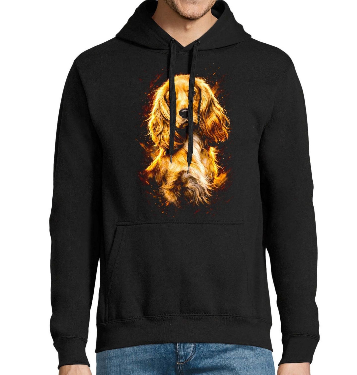Pánská mikina Zlatý Kokršpaněl. Tento působivý motiv zachycuje krásného psa s dlouhýma ušima a jemnou, lesklou srstí. Jedná se o plemeno anglický kokršpaněl, které je známé svou přátelskou povahou, inteligencí a elegancí. Umělecké zpracování se zlatavými efekty dodává motivu luxusní a výrazný vzhled. Každý pejskař ocení detailní zpracování a charakter, který tento pes vyzařuje.