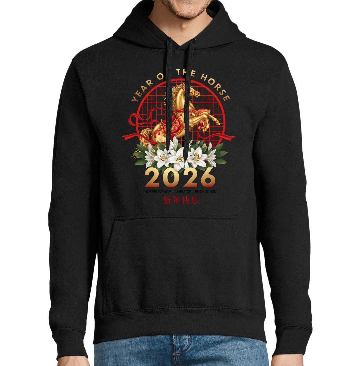 Pánská mikina Zlatý Kůň Čínský Nový Rok 2026. Kůň jako silný symbol úspěchu, vitality a vytrvalosti, který je ústředním znamením pro nový rok podle čínského lunárního kalendáře. Design je inspirován tradiční čínskou estetikou a oslavuje čínský rok ohnivého koně, období spojené s odvahou, růstem a novými začátky. Zlaté tóny vyjadřují prosperitu a hojnost, zatímco červené prvky přinášejí štěstí a ochranu.