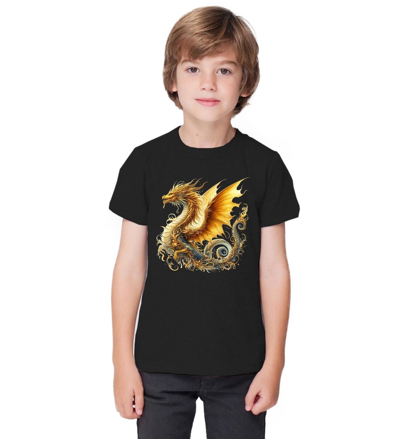 Dětské tričko Zlatý Majestátní Drak. Okouzlující motiv, kde se mocný zlatý drak vznáší v elegantních křivkách a září jako bájný ochránce pokladů. Bohaté detaily, ornamenty a mystická atmosféra proměňují tento motiv v opravdu jedinečné fantasy umění, které si zamilují všichni milovníci kouzel, mýtů a draků.