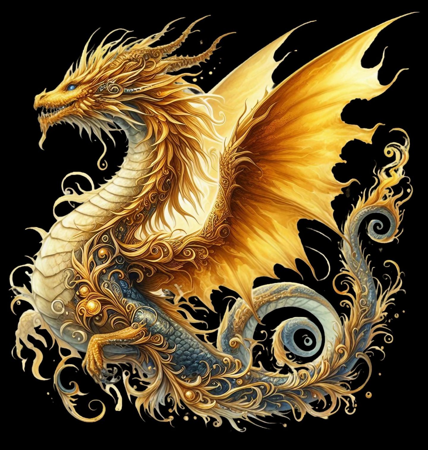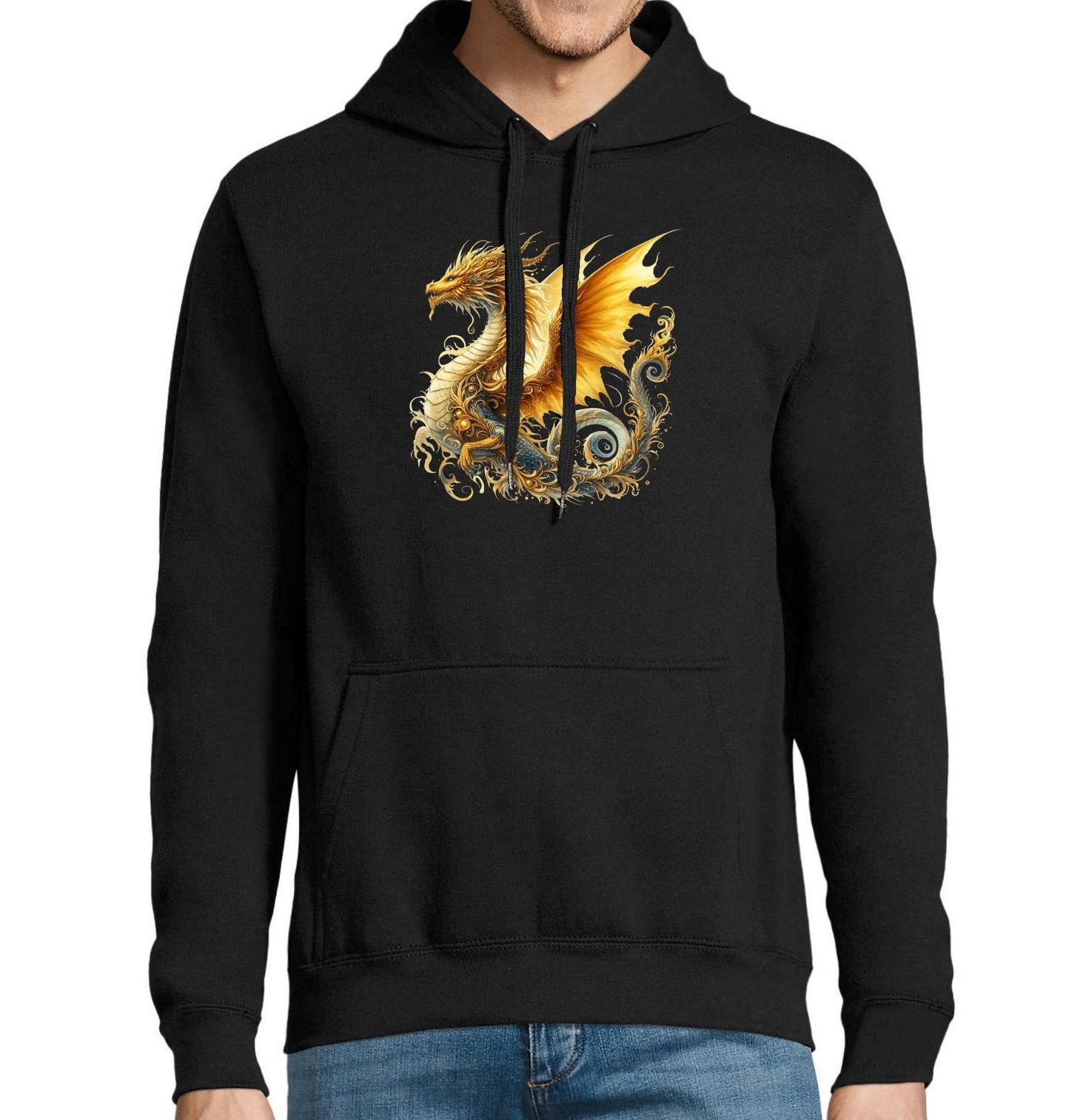 Pánská mikina Zlatý Majestátní Drak. Okouzlující motiv, kde se mocný zlatý drak vznáší v elegantních křivkách a září jako bájný ochránce pokladů. Bohaté detaily, ornamenty a mystická atmosféra proměňují tento motiv v opravdu jedinečné fantasy umění, které si zamilují všichni milovníci kouzel, mýtů a draků.