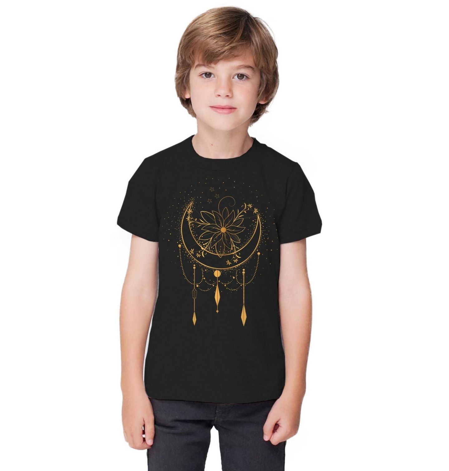 Dětské tričko Zlatý Půlměsíc Amulet. Tento luxusní motiv přináší na tvé tričko jedinečný mandala styl, který vyzařuje klid a harmonii. Detailně propracovaný květ uvnitř půlměsíce tvoří elegantní obrazec připomínající meditační obrazec. Zlaté řetízky a geometrické přívěsky dodávají designu prémiový vzhled a hloubku. Je to ideální kousek pro každého, kdo hledá spirituální design spojený s moderní estetikou.