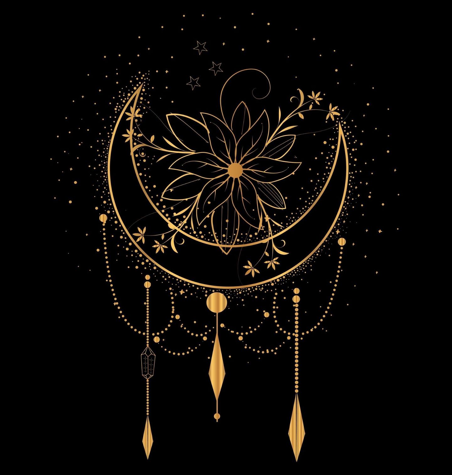 Pánská mikina Zlatý Půlměsíc Amulet. Tento luxusní motiv přináší na tvé tričko jedinečný mandala styl, který vyzařuje klid a harmonii. Detailně propracovaný květ uvnitř půlměsíce tvoří elegantní obrazec připomínající meditační obrazec. Zlaté řetízky a geometrické přívěsky dodávají designu prémiový vzhled a hloubku. Je to ideální kousek pro každého, kdo hledá spirituální design spojený s moderní estetikou.