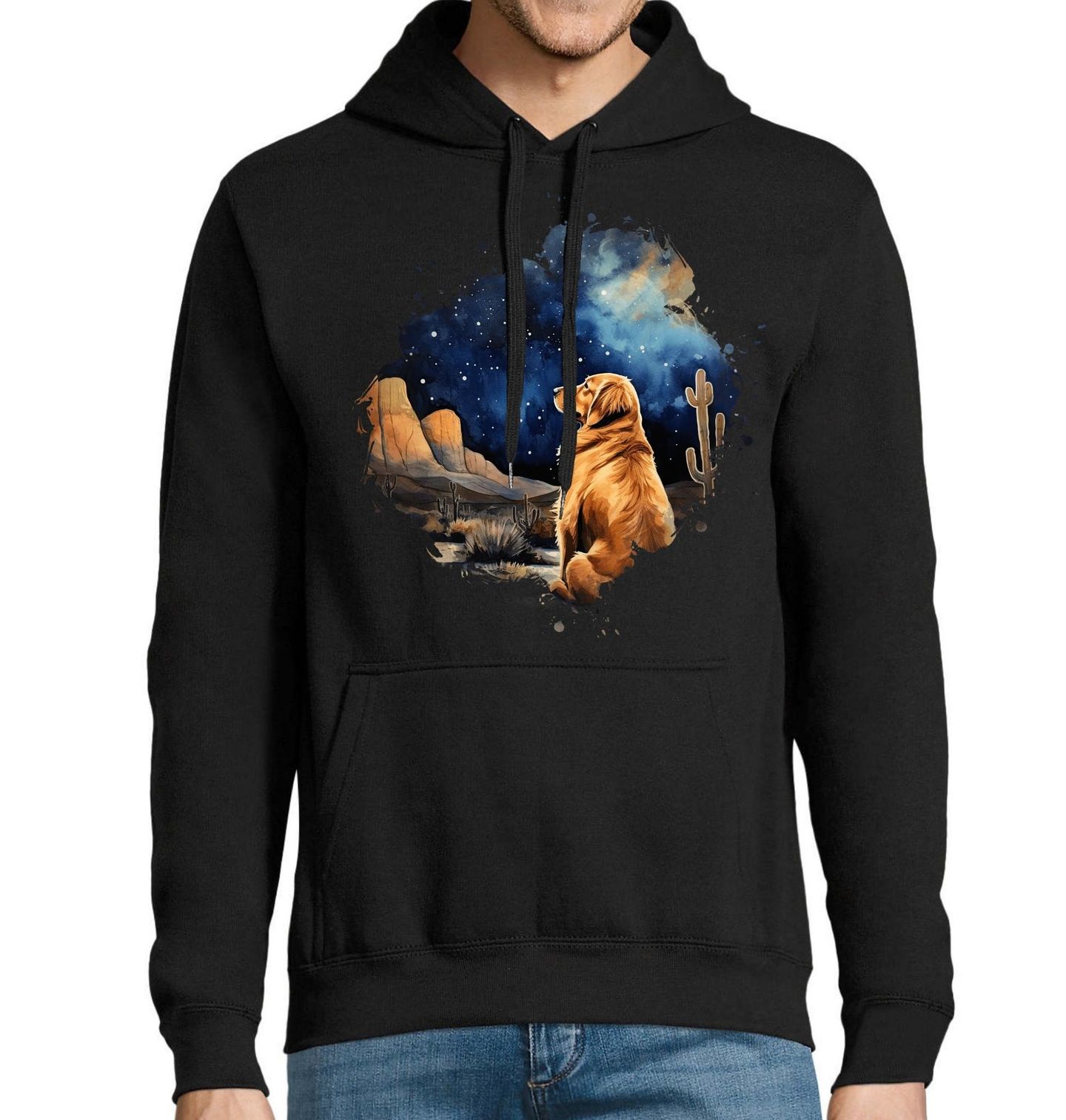 Pánská mikina Zlatý retrívr pod Hvězdami v Poušti. Motiv osloví každého pejskař, který vnímá psa jako parťáka na cestách i v životě. Pes Zlatý retrívr zde symbolizuje oddanost, moudrost a schopnost být oporou i v těch nejtišších chvílích. Tiše sedí v krajině, kde vládne klid, hvězdy a nekonečná poušť.