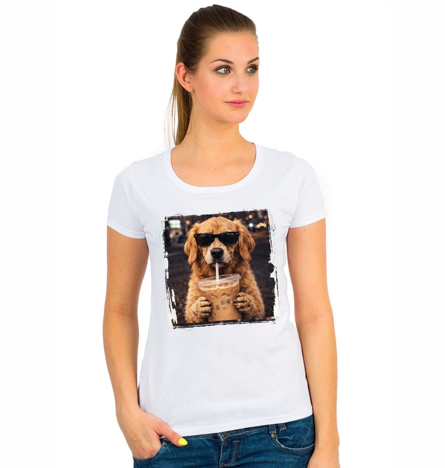 Dámské tričko Zlatý retrívr s Ledovou Kávou. Stylový motiv zachycuje pohodového psa, který působí naprosto uvolněně. Tento pes s brýlemi je ideální kombinací humoru a moderního designu, kterou ocení každý pejskař. Na obrázku je plemeno golden retriever, známé svou přátelskou povahou, inteligencí a typickou zlatavou srstí. Spojení roztomilého psa a prvku ledová káva vytváří jedinečný design, který zaujme na první pohled.