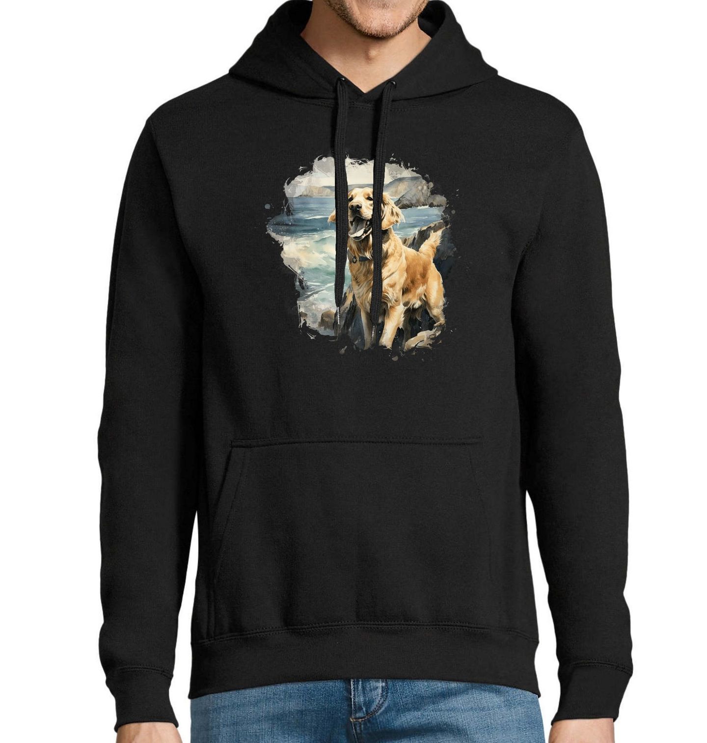 Pánská mikina Zlatý retrívr u Pobřeží. Nádherný motiv zobrazující Zlatého retrívra na skalnatém pobřeží oceánu potěší každého pejskaře, který vnímá svého psa jako společníka na každém dobrodružství. Zlatý retrívr – pes plný radosti a oddanosti – v sobě na tomto designu spojuje lásku ke zvířatům i k přírodě.