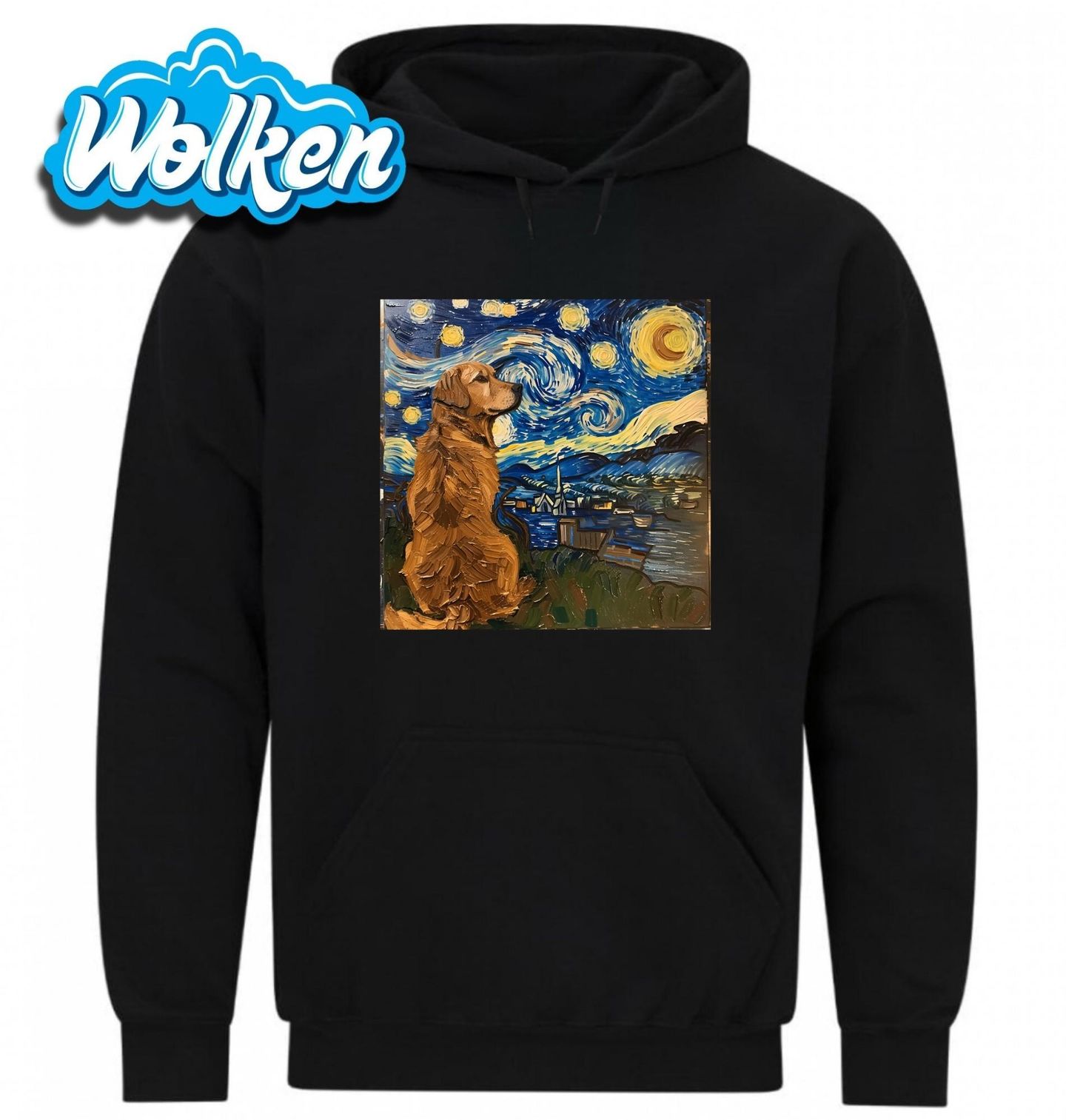 Pánská mikina Zlatý retrívr ve Hvězdné noci. Tento pes klidně sedí a pozoruje slavné víry z obrazu Hvězdná noc od Vincenta van Gogha. Spojení ikonického umění a psí věrnosti vytváří harmonický design, který potěší milovníky psů i klasické malby. Triko ideální pro pejskaře a pro ty, kdo si užívají klid a nostalgii.