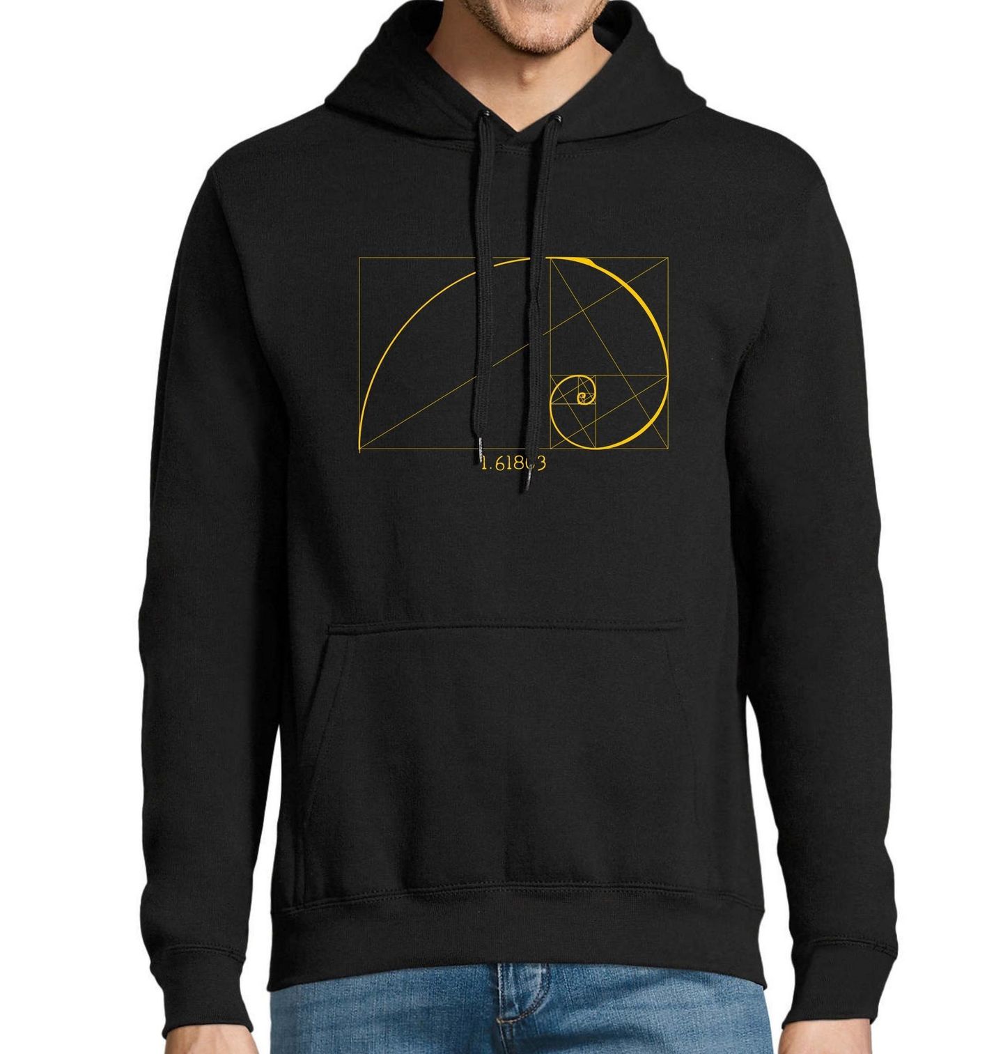 Pánská mikina Zlatý řez 1.61803. Tento motiv zobrazuje slavný zlatý řez (tzv. „božské číslo“), přibližně 1.61803, který je matematickým poměrem nacházejícím se v přírodě, umění i architektuře. Fibonacciho spirála, vychází ze známé posloupnosti, kterou popsal italský matematik Leonardo Fibonacci. Tento design je vizuálním důkazem, že matematika může být krásná – ideální pro každého geeka.