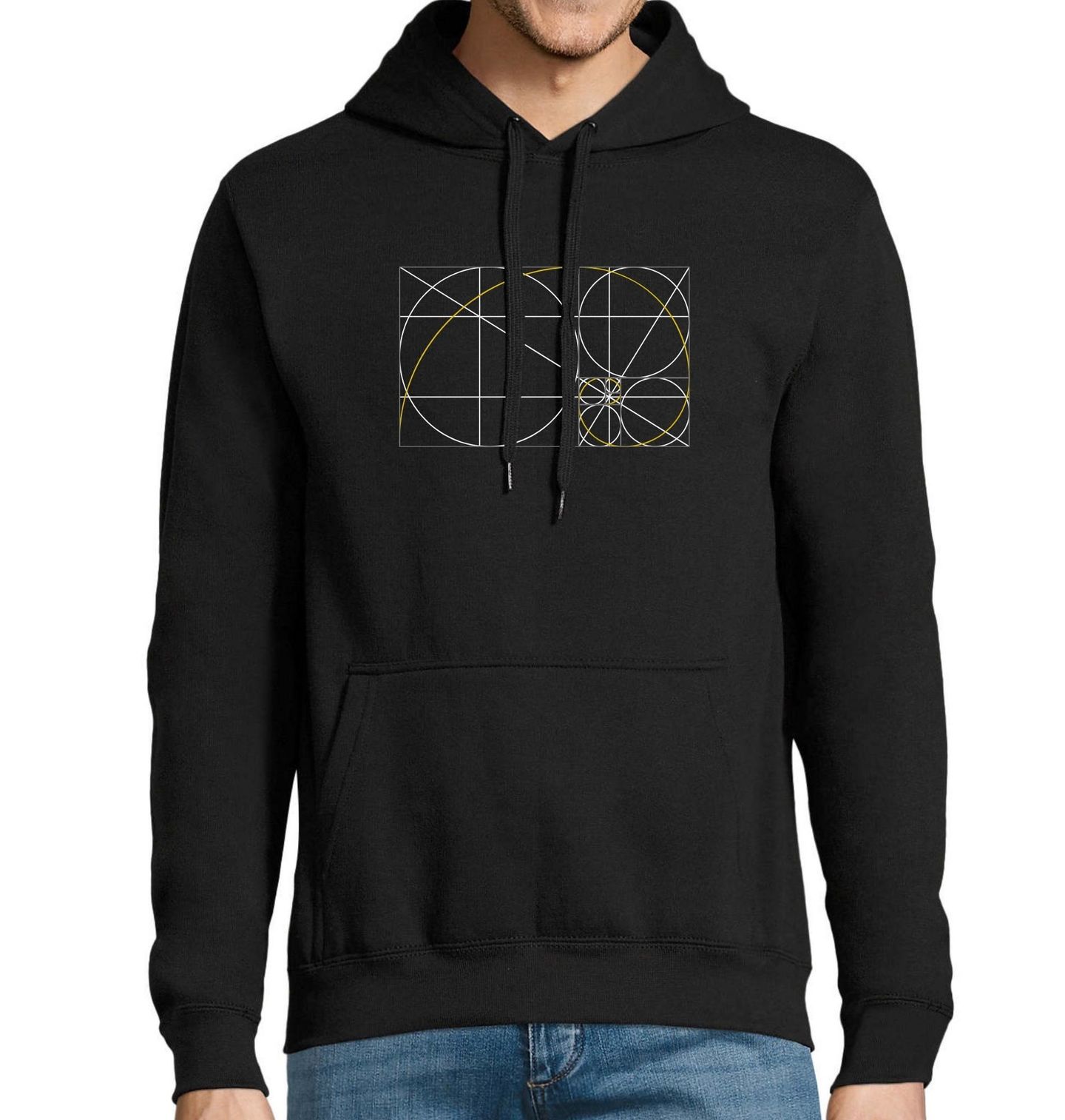 Pánská mikina Zlatý Řez v Geometrii. Tento elegantní motiv ukazuje, jak dokonale může fungovat zlatý řez v praxi. Přesné linie, kružnice a oblouk vytvářejí harmonickou kompozici, která je postavená na poměru 1,618. Se zlatým řezem je neodmyslitelně spojen také Leonardo Fibonacci, protože jeho slavná posloupnost se tomuto poměru přirozeně blíží.