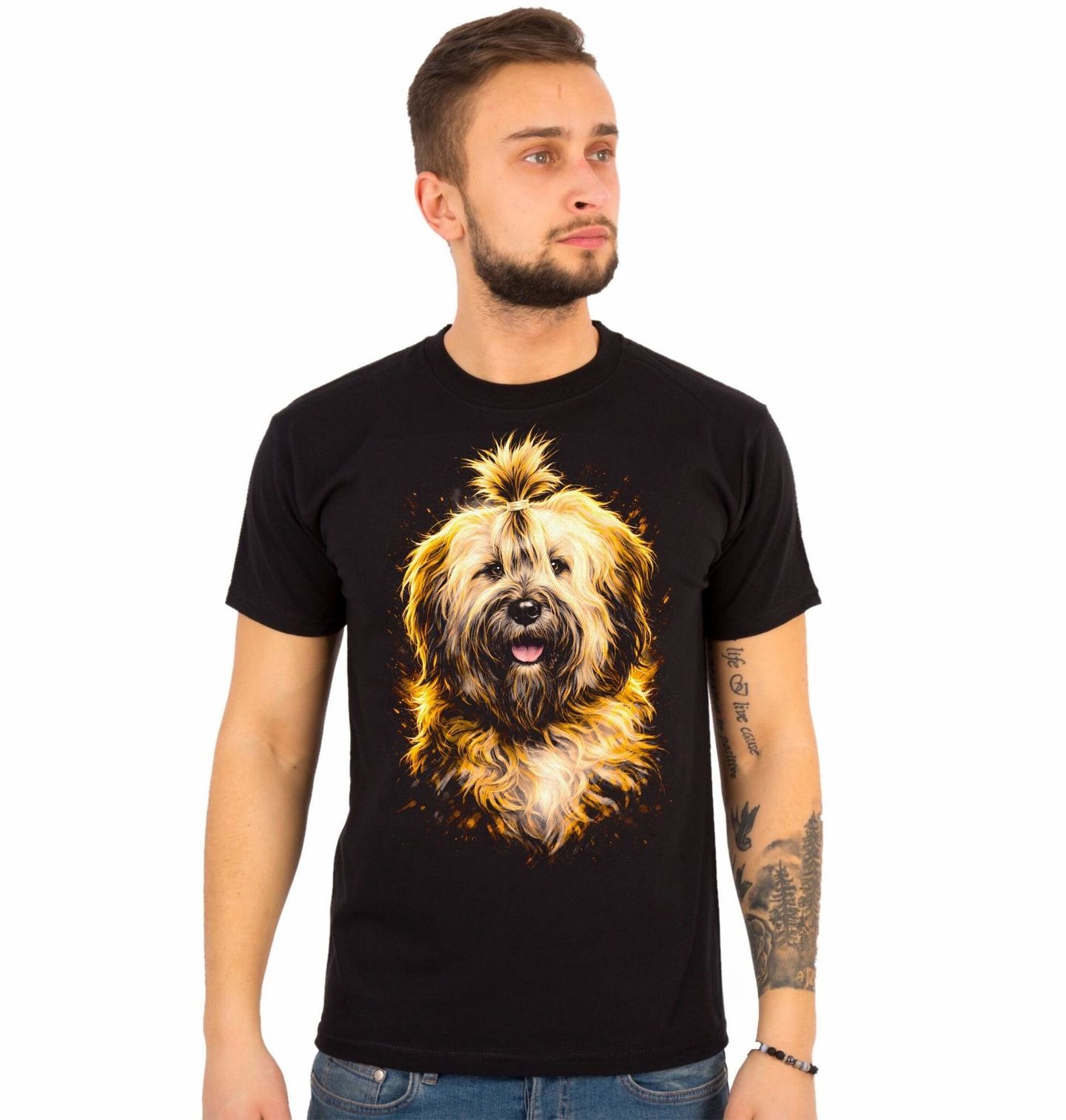 Pánské tričko Zlatý Tibetský teriér. Tibetský teriér v moderním, zářivém stylu plném teplých barev a energie. Detailní ilustrace zvýrazňuje dlouhou, hustou srst, typický výraz a přátelskou povahu, díky které je tento pes skvělým společníkem. Perfektní volba pro každého pejskař, který chce vyjádřit svou lásku ke svému čtyřnohému parťákovi stylově a originálně.