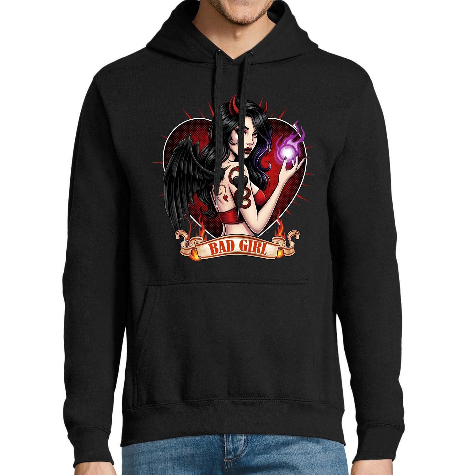 Pánská mikina Zlobivá Holka Bad Girl. Stylový a výrazný motiv zobrazuje tajemnou ďábelskou dívku s křídly, rohy a magickou energií v ruce, zasazenou do srdce plného vášně a ohně. Nápis na motivu „Bad Girl“ znamená v překladu „zlobivá holka“ a vystihuje rebelskou atmosféru celého designu.