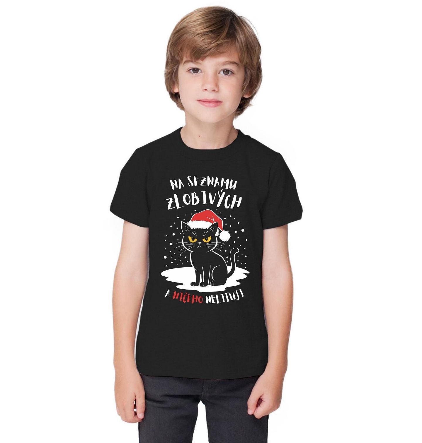 Dětské tričko Zlobivá Kočka o Vánocích. Vánoce nejsou jen o cukroví a roztomilých sobech – občas se objeví i pořádná rebelka! Stylový motiv s černou kočkou v čepici Santa Clause a nápisem „Na seznamu zlobivých – a ničeho nelituji“ je perfektní pro všechny milovníky koček, kteří mají smysl pro humor a trošku drzosti.