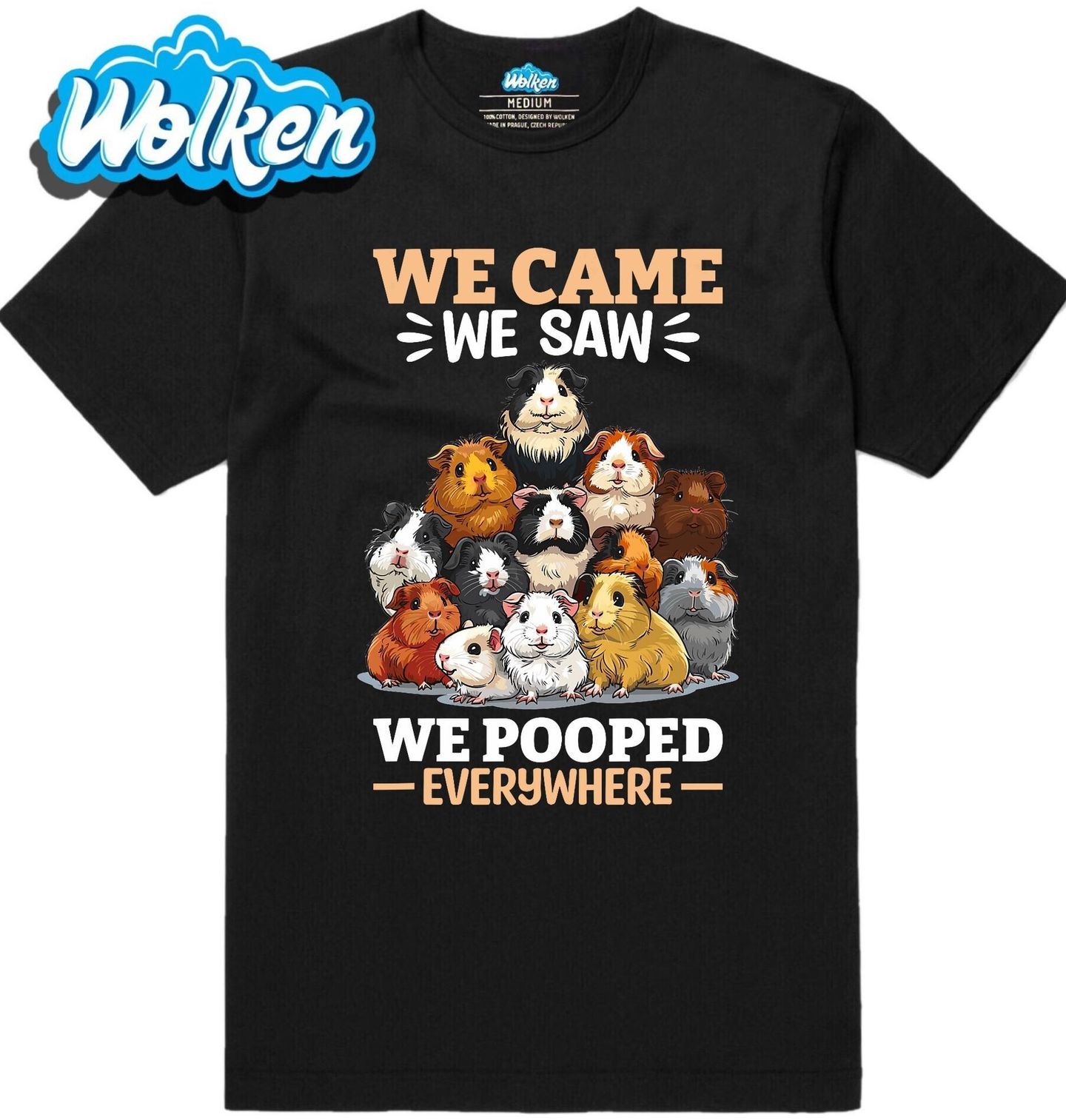 Pánské tričko Zlobivá Morčata domácí. "We Came, We Saw, We Pooped Everywhere" česky Přišli jsme, viděli jsme, pokadili jsme to všude. Motiv vystihuje každého majitele, kterému morče zanechalo nezapomenutelnou "stopu" na různých místech. Zaručeně vykouzlí úsměv na tváři každého, kdo má doma chlupatého mazlíčka.