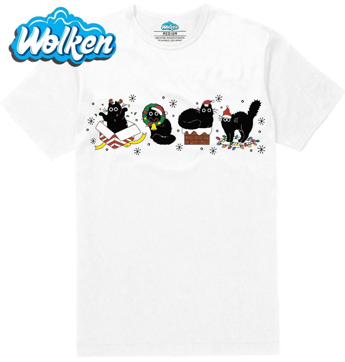 Pánské tričko Zlobivá Vánoční Kočka. Když se kočka rozhodne oslavit Vánoce po svém, vznikne naprostý chaos – a taky tenhle vtipný motiv! Černé kočky ve vánočních rolích se válejí v dárkové krabici, schovávají ve věnci, polehávají na komíně nebo zápasí se světýlky. Ideální pro všechny, kdo milují kočku a mají smysl pro humor během Vánoc.