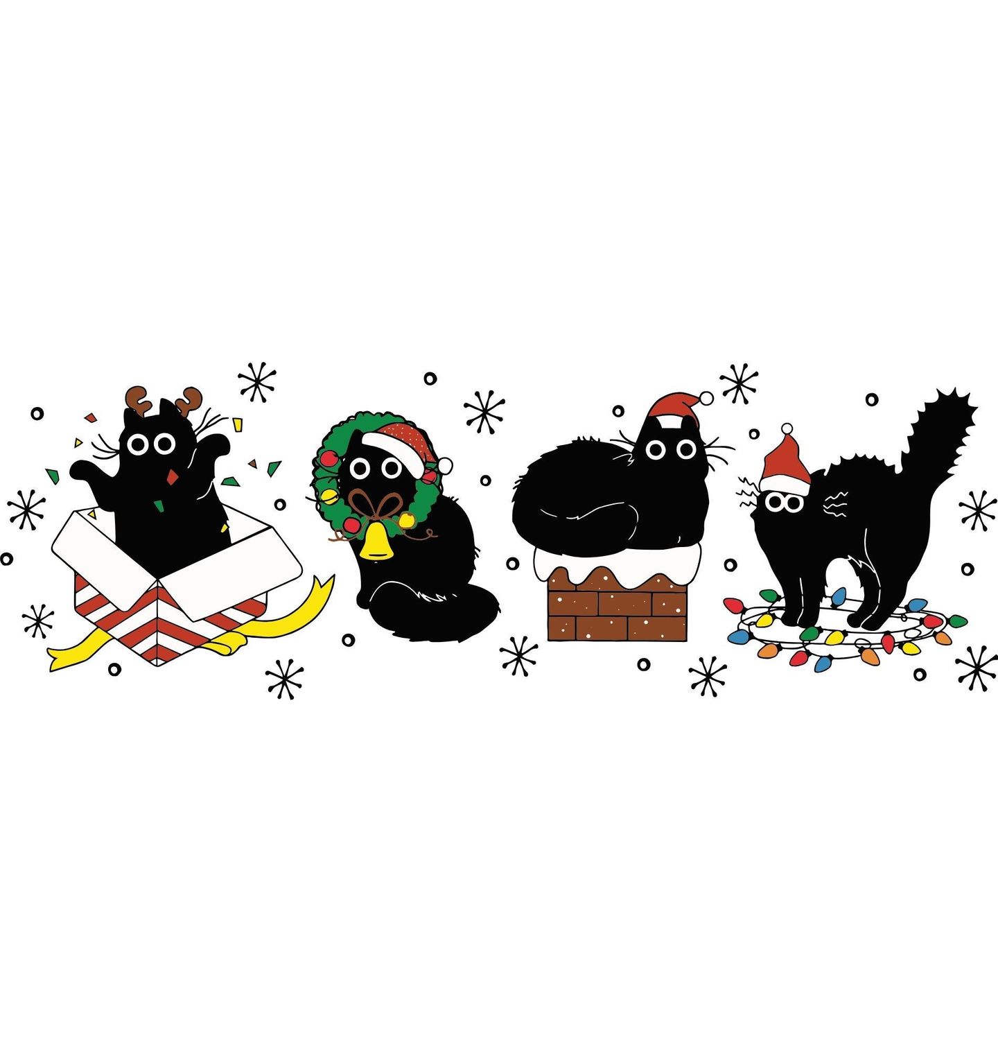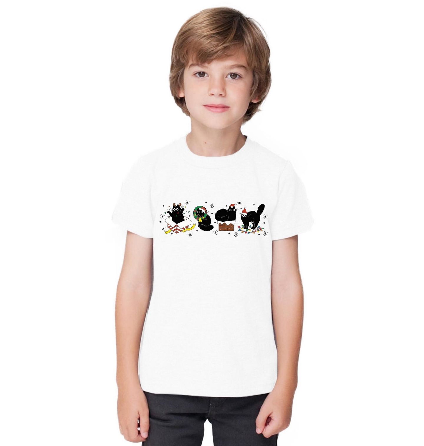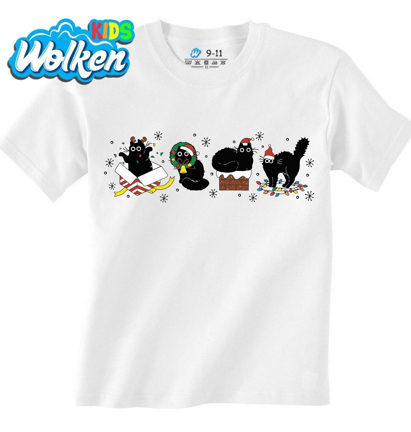 Dětské tričko Zlobivá Vánoční Kočka. Když se kočka rozhodne oslavit Vánoce po svém, vznikne naprostý chaos – a taky tenhle vtipný motiv! Černé kočky ve vánočních rolích se válejí v dárkové krabici, schovávají ve věnci, polehávají na komíně nebo zápasí se světýlky. Ideální pro všechny, kdo milují kočku a mají smysl pro humor během Vánoc.