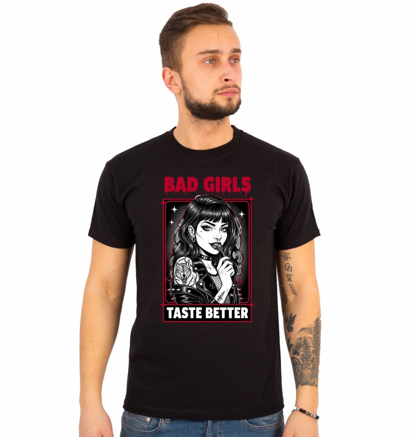 Pánské tričko Zlobivé holky chutnají lépe Bad Girls Taste Better. Výrazný design s temnou estetikou a rebelským nádechem zaujme na první pohled. Ilustrace zachycuje stylovou dívku v punkovém stylu s lízátkem a výrazným tetováním, doplněnou nápisem „Bad girls taste better“, což v překladu znamená „zlobivé holky chutnají lépe“.