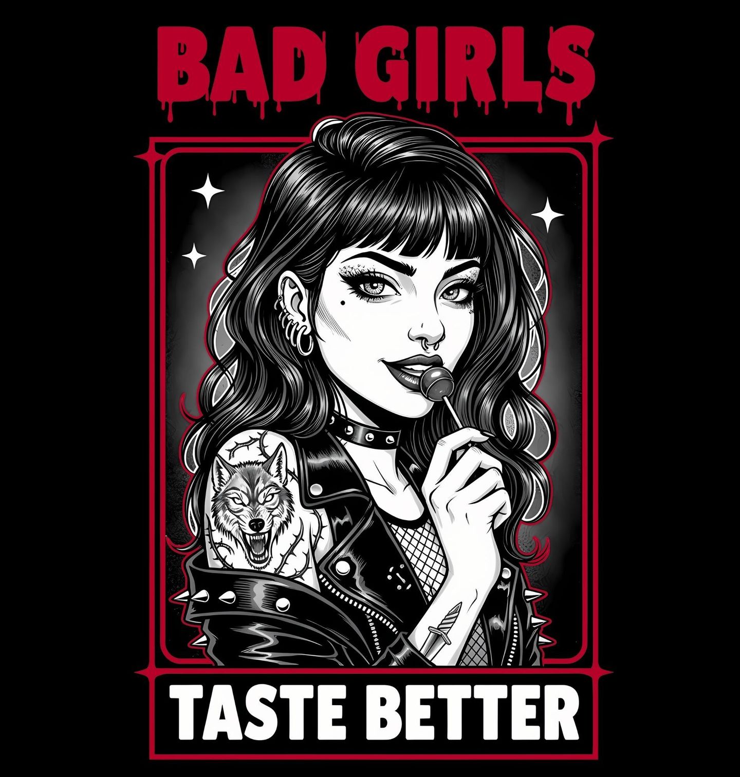 Dámské tričko Zlobivé holky chutnají lépe Bad Girls Taste Better. Výrazný design s temnou estetikou a rebelským nádechem zaujme na první pohled. Ilustrace zachycuje stylovou dívku v punkovém stylu s lízátkem a výrazným tetováním, doplněnou nápisem „Bad girls taste better“, což v překladu znamená „zlobivé holky chutnají lépe“.