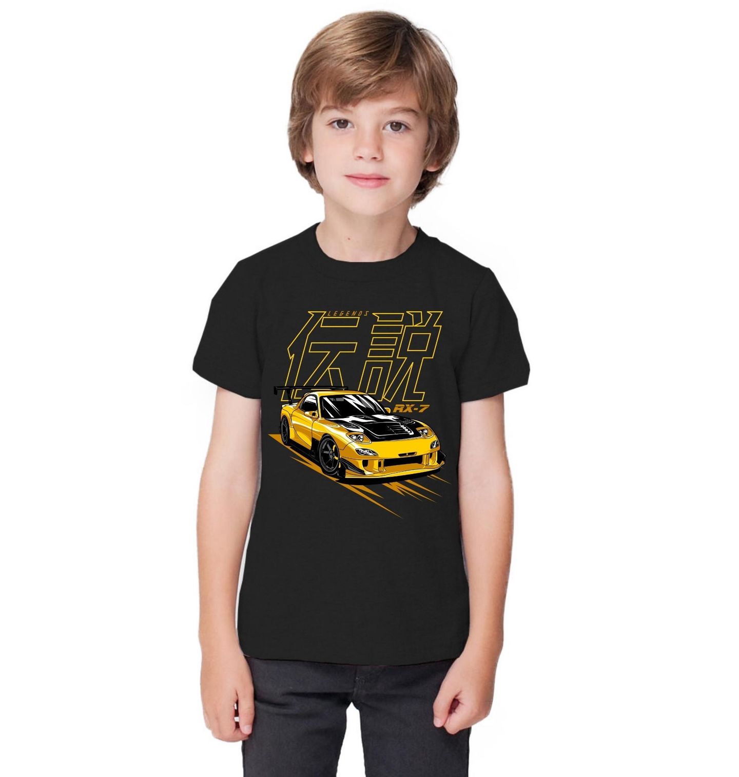 Dětské tričko Žlutá Mazda RX-7 Legend. Ikonický motiv inspirovaný legendárním modelem Mazda RX-7 FD představuje čistokrevné japonské sportovní auto, které se stalo symbolem výkonu a unikátní rotační technologie. Tento design zachycuje agresivní bodykit, výraznou kapotu a závodní postoj, který proslavil scénu JDM po celém světě.