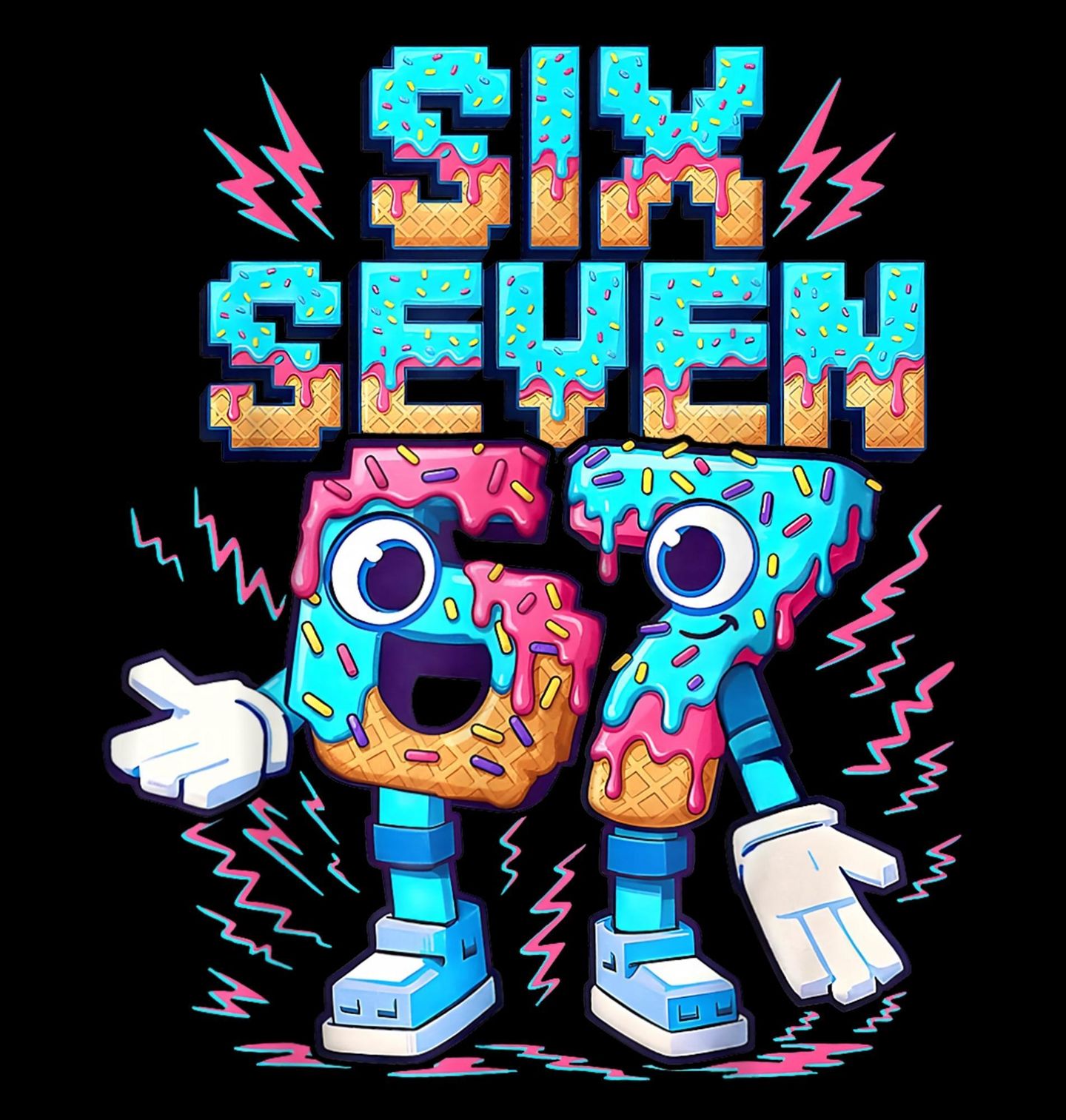Pánské tričko Zmrzlinový Meme 67 Six Seven. Vtipný motiv 67 ve stylu six seven meme, kde se čísla proměnila v modré kreslené postavičky s velkýma očima, botami a usměvavými výrazy. Číslo 67 tu působí jako kamarádská dvojka, která šíří dobrou náladu a hravý humor. Ideální design pro všechny fanoušky číselných memů, srandy a originálních motivů.