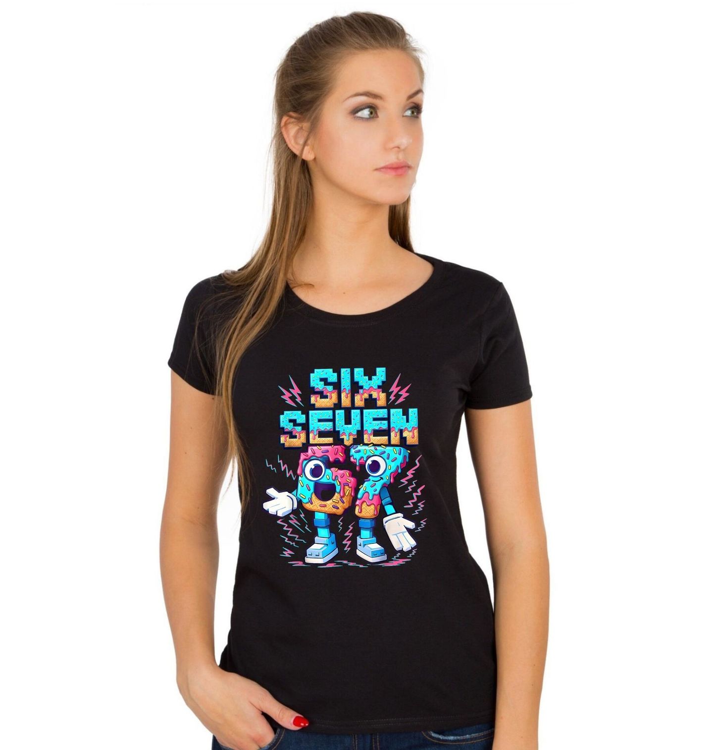 Dámské tričko Zmrzlinový Meme 67 Six Seven. Vtipný motiv 67 ve stylu six seven meme, kde se čísla proměnila v modré kreslené postavičky s velkýma očima, botami a usměvavými výrazy. Číslo 67 tu působí jako kamarádská dvojka, která šíří dobrou náladu a hravý humor. Ideální design pro všechny fanoušky číselných memů, srandy a originálních motivů.