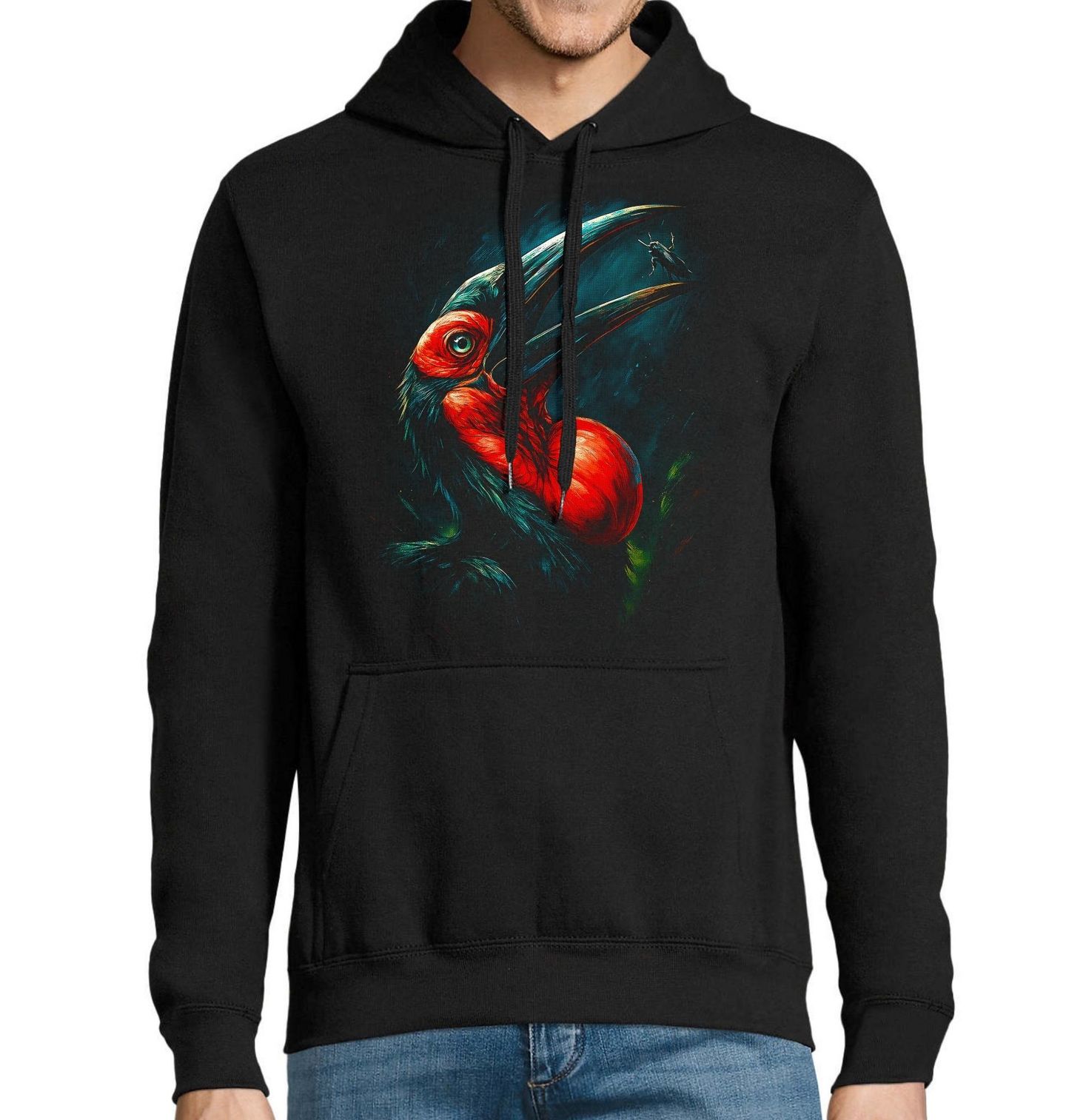 Pánská mikina Zoborožec kaferský. Zoborožec kaferský je mohutný pták, jeden ze dvou zástupců čeledi Bucorvidae. Vyskytuje se v jižní Africe, kde obývá savany a lesy. Jedná se o největšího představitele řádu zoborožci. Pták zoborožec patří mezi ikonické druhy pralesních ptáků a je symbolem divoké přírody, síly a jedinečnosti.