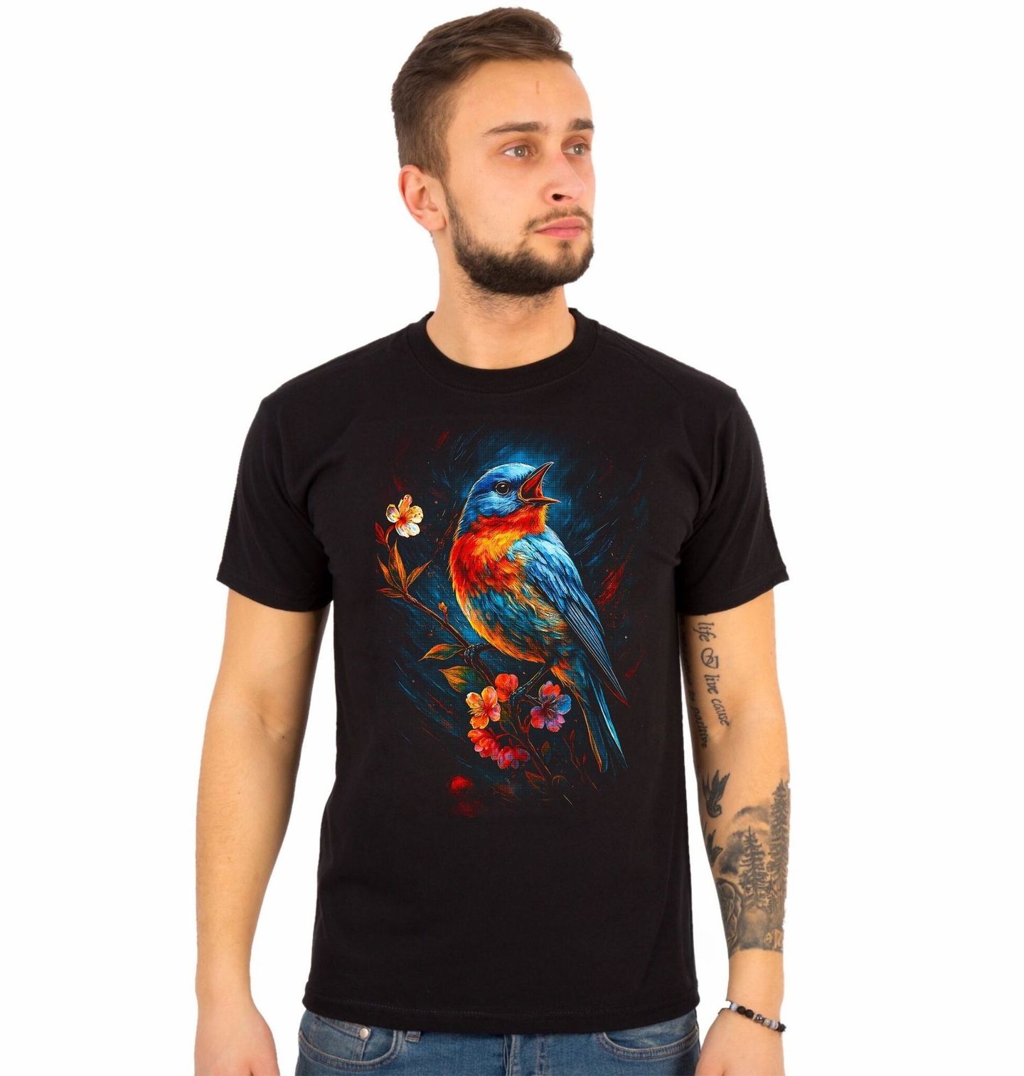 Pánské tričko Zpěvný Salašník. Salašník modrý je známý svou výjimečnou inteligencí, hlasovým projevem a smyslem pro estetiku. Ilustrace zachycuje salašníka v okamžiku zpěvu, s otevřeným zobákem a bohatým, barevným peřím, které symbolizuje energii, radost a kreativitu.