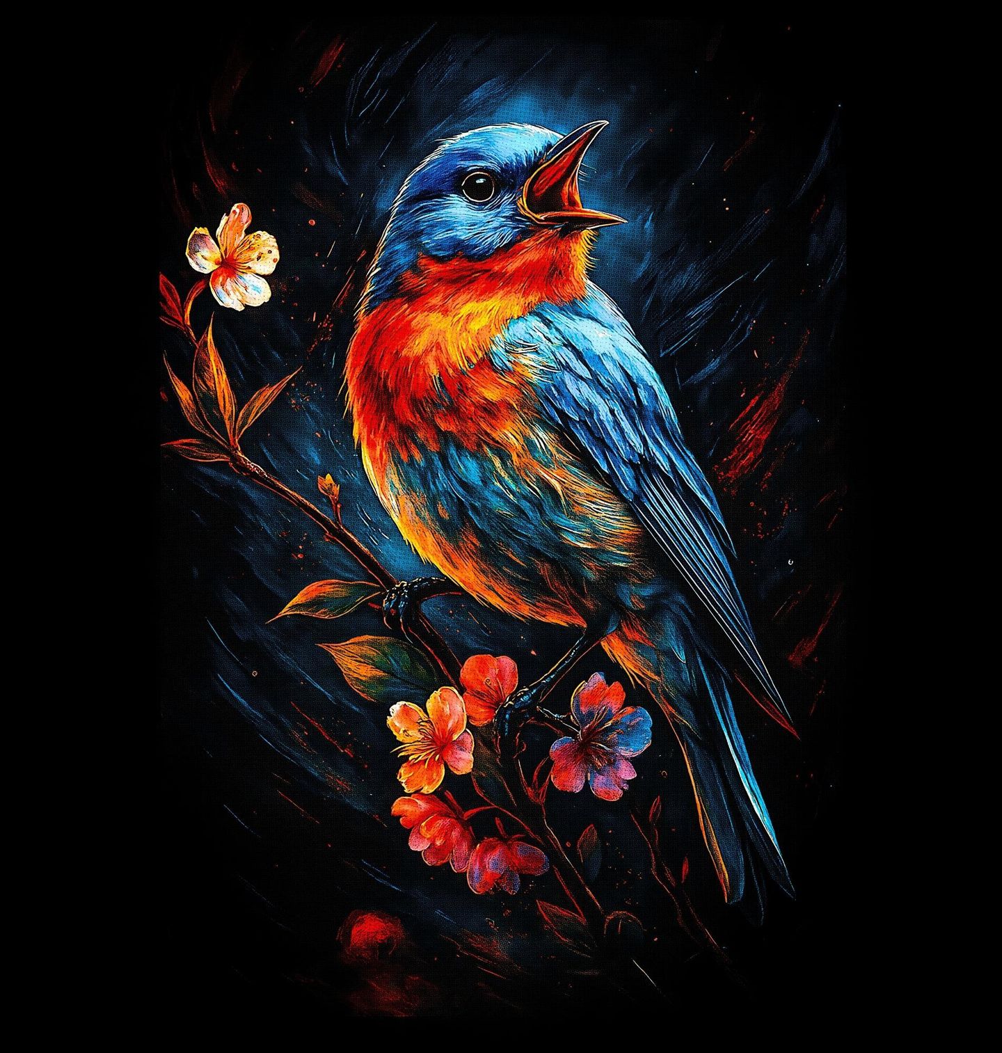 Dámské tričko Zpěvný Salašník. Salašník modrý je známý svou výjimečnou inteligencí, hlasovým projevem a smyslem pro estetiku. Ilustrace zachycuje salašníka v okamžiku zpěvu, s otevřeným zobákem a bohatým, barevným peřím, které symbolizuje energii, radost a kreativitu.