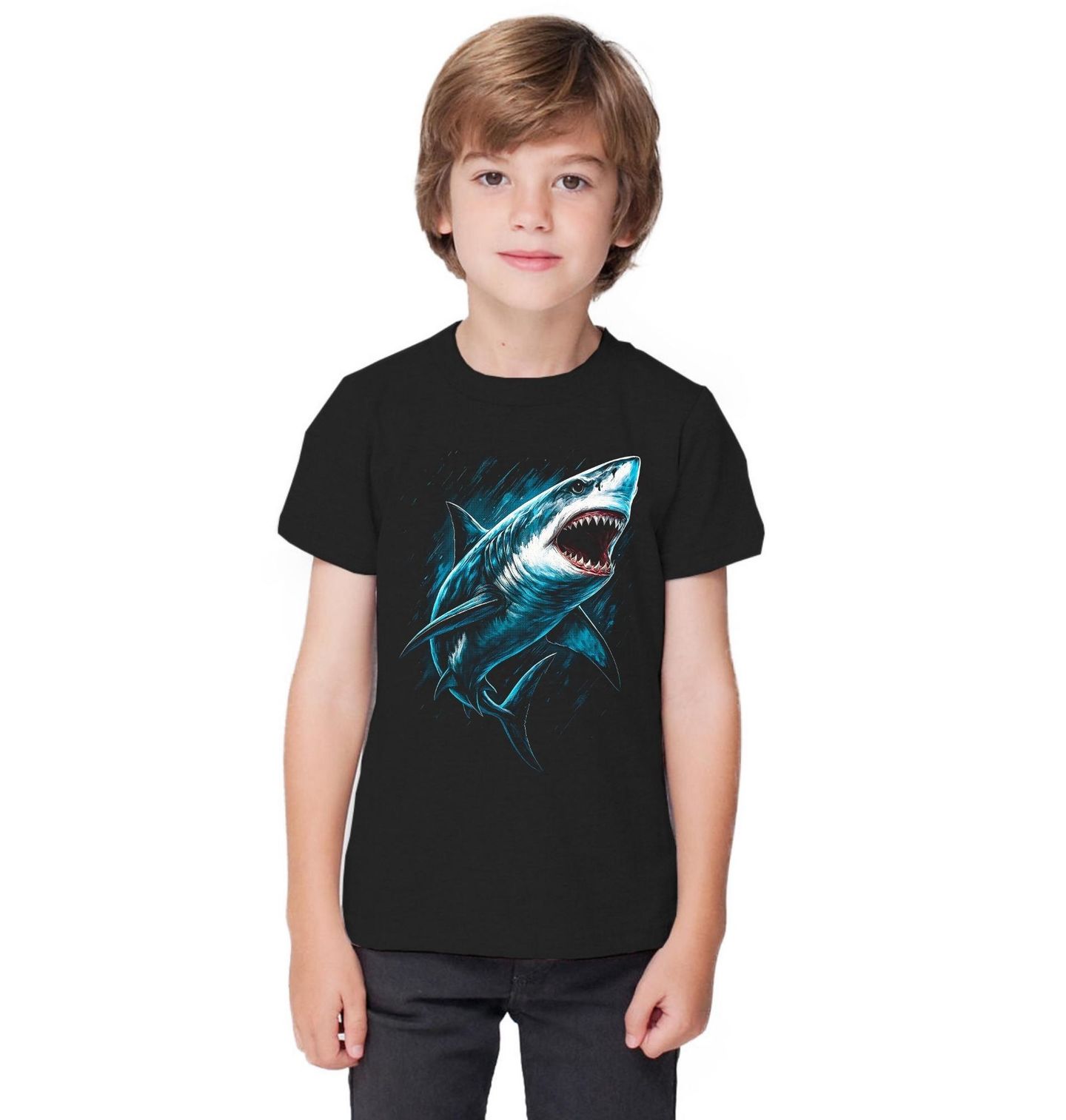 Dětské tričko Žralok bílý. Tento silný motiv zachycuje žraloka bílého (Carcharodon carcharias), nejznámějšího a nejobávanějšího predátora světových oceánů. Otevřená tlama plná zubů, dynamický pohyb a kontrast světla a temnoty vytvářejí scénu, která okamžitě přitahuje pozornost. Právě proto je tento motiv blízký lidem, kteří chápou rybaření jako spojení s přírodou, ne jako souboj.