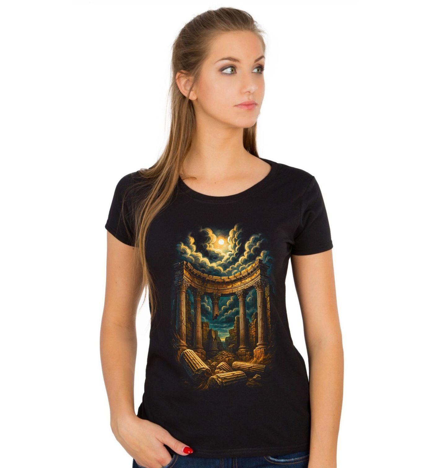 Dámské tričko Zřícený Olymp v Ruinách. Tajemné ruiny zahalené měsíčním světlem symbolizují bájný Olymp – posvátné sídlo řeckých bohů, kde podle legend vládl Zeus a odkud bohové rozhodovali o osudech lidí. Řecká mytologie je plná hrdinů, bohů a epických příběhů a právě Olymp stojí v jejím samotném středu. Hora Olymp nebyla jen místem na mapě, ale symbolem moci, nesmrtelnosti a božského řádu.