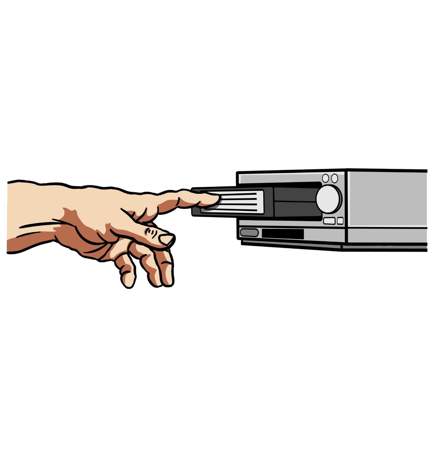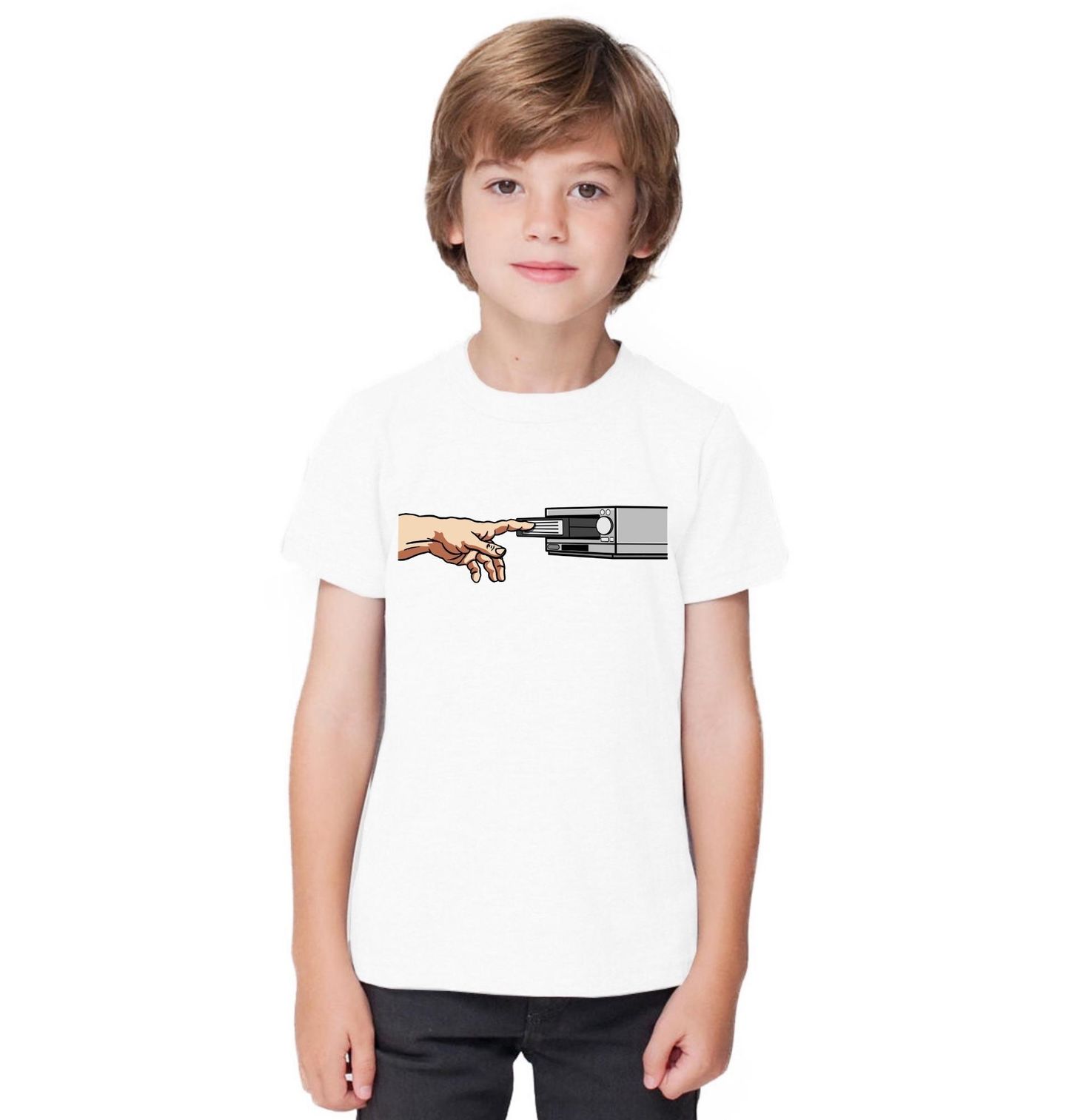 Dětské tričko Zrození Kazety. Humorný design VHS kazety odkazuje na slavnou Michelangelovu scénu stvoření Adama. Místo Boží ruky se však lidská ruka dotýká vysouvající se kazety z přehrávače.